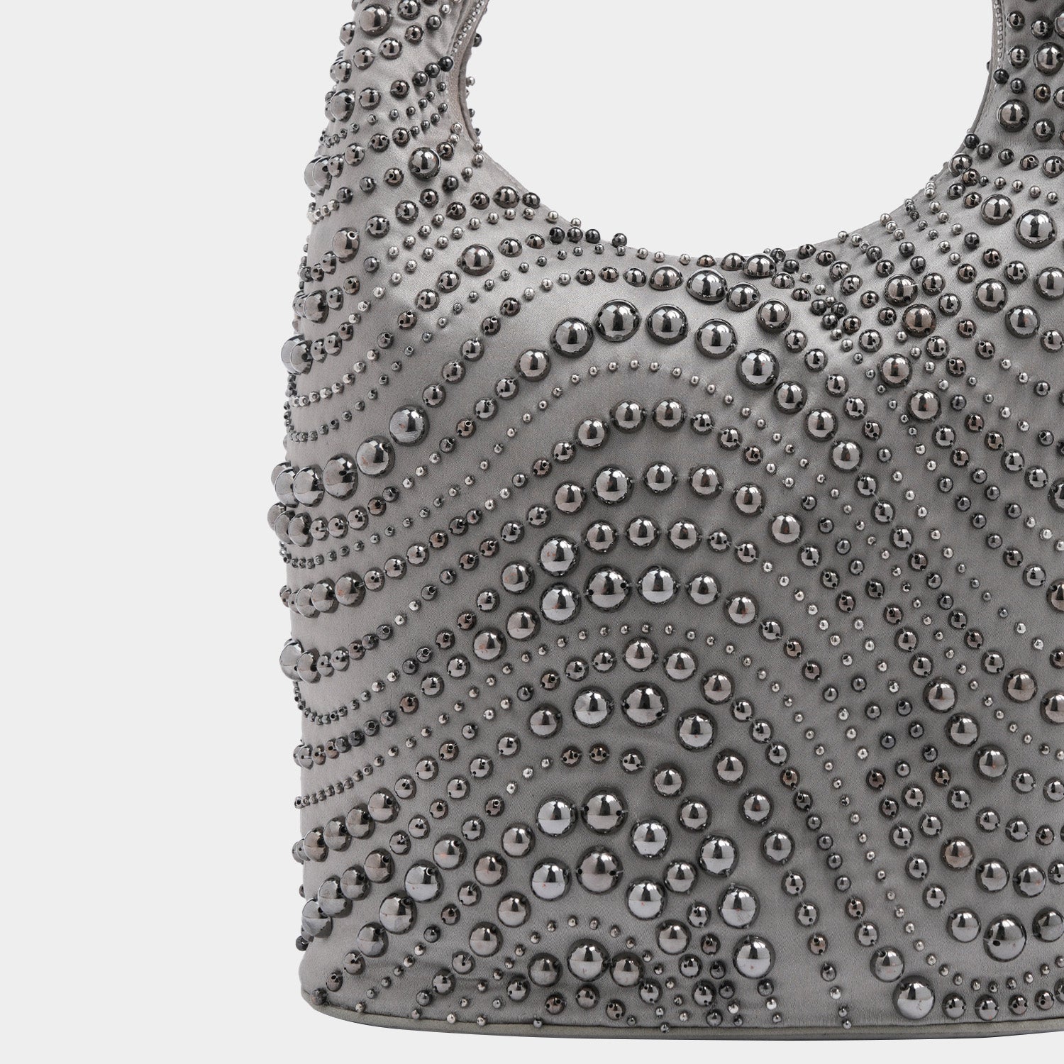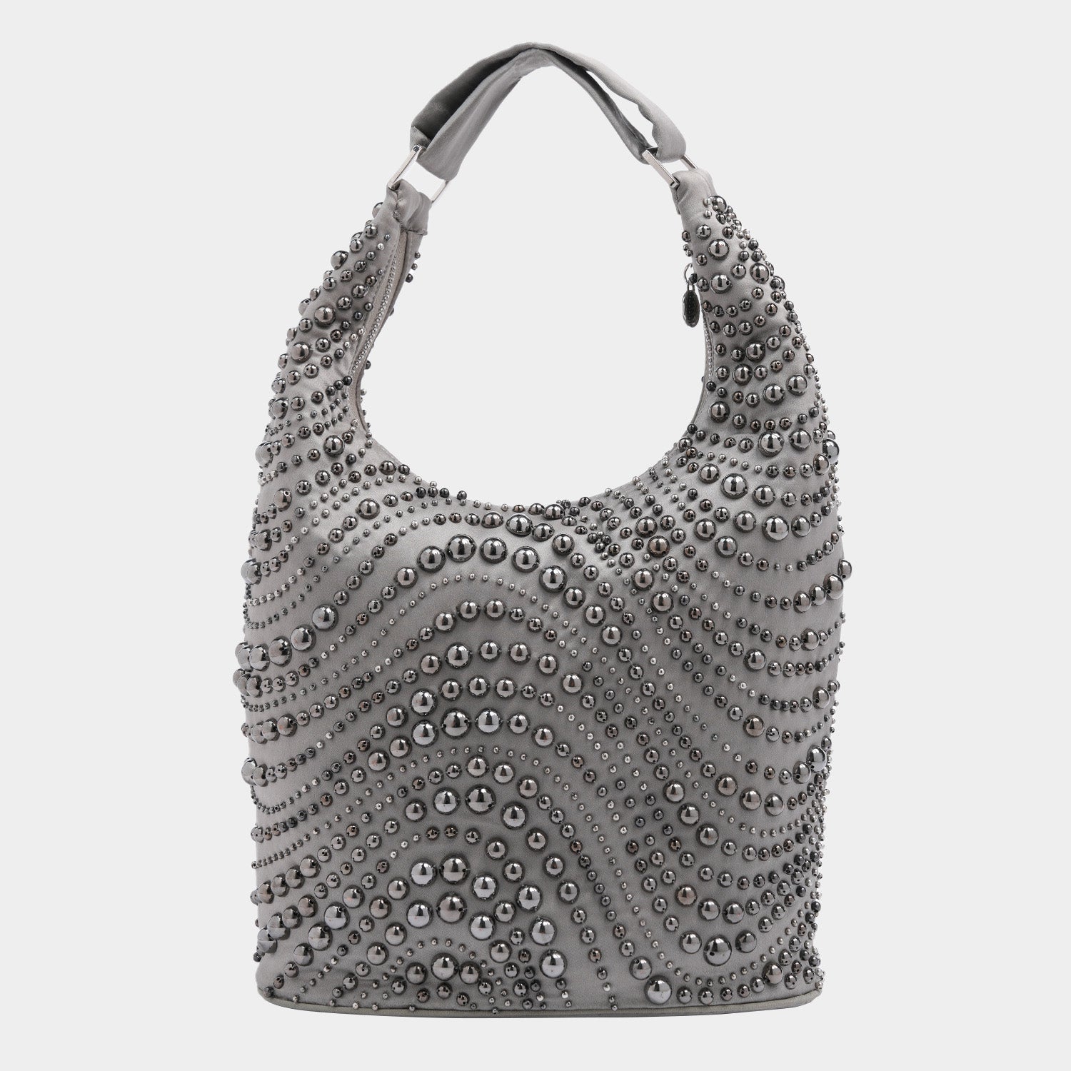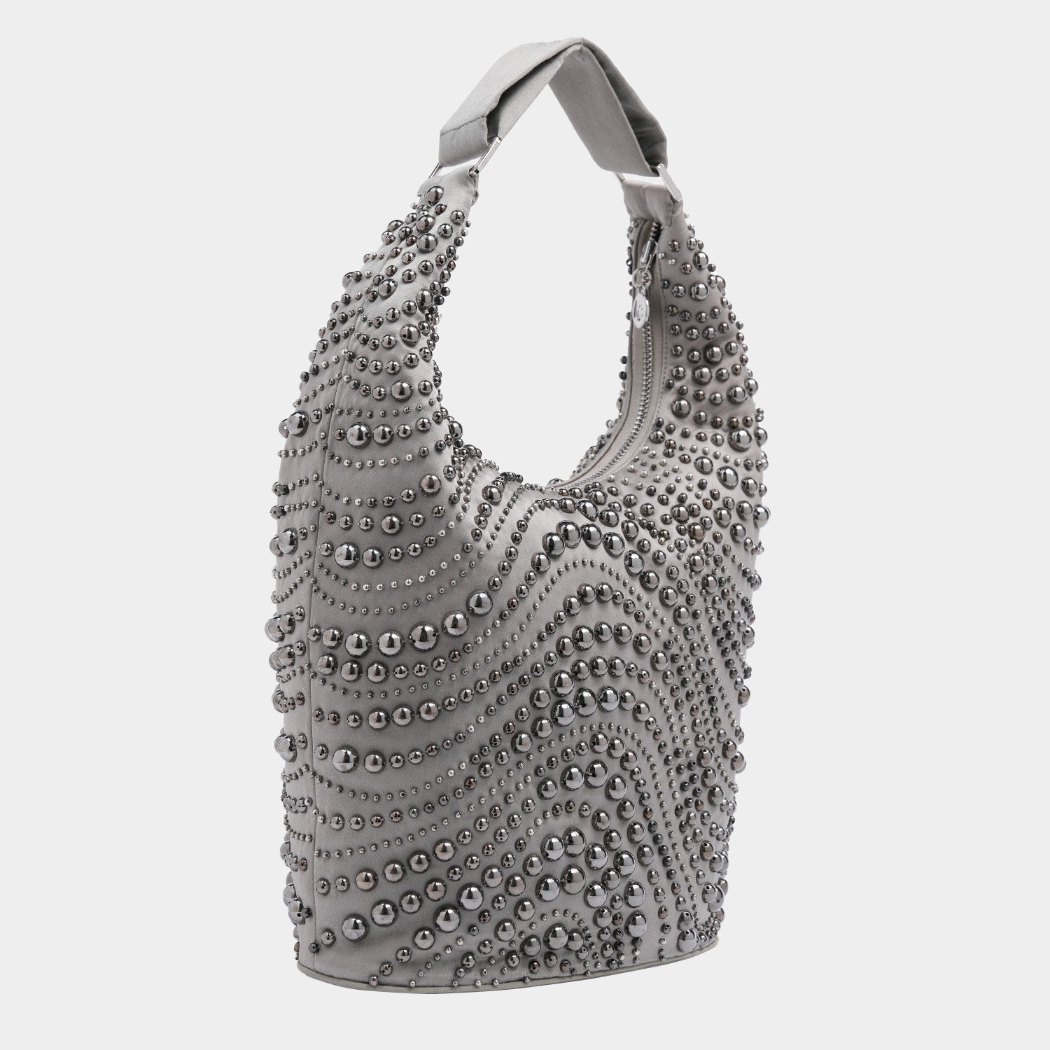 Forest Of Chintz presents a Glamorous take on the Hobo Bag. This stunning bag is made with different sizes of Cabochon in gunmetal on grey silk. It’s a must have.