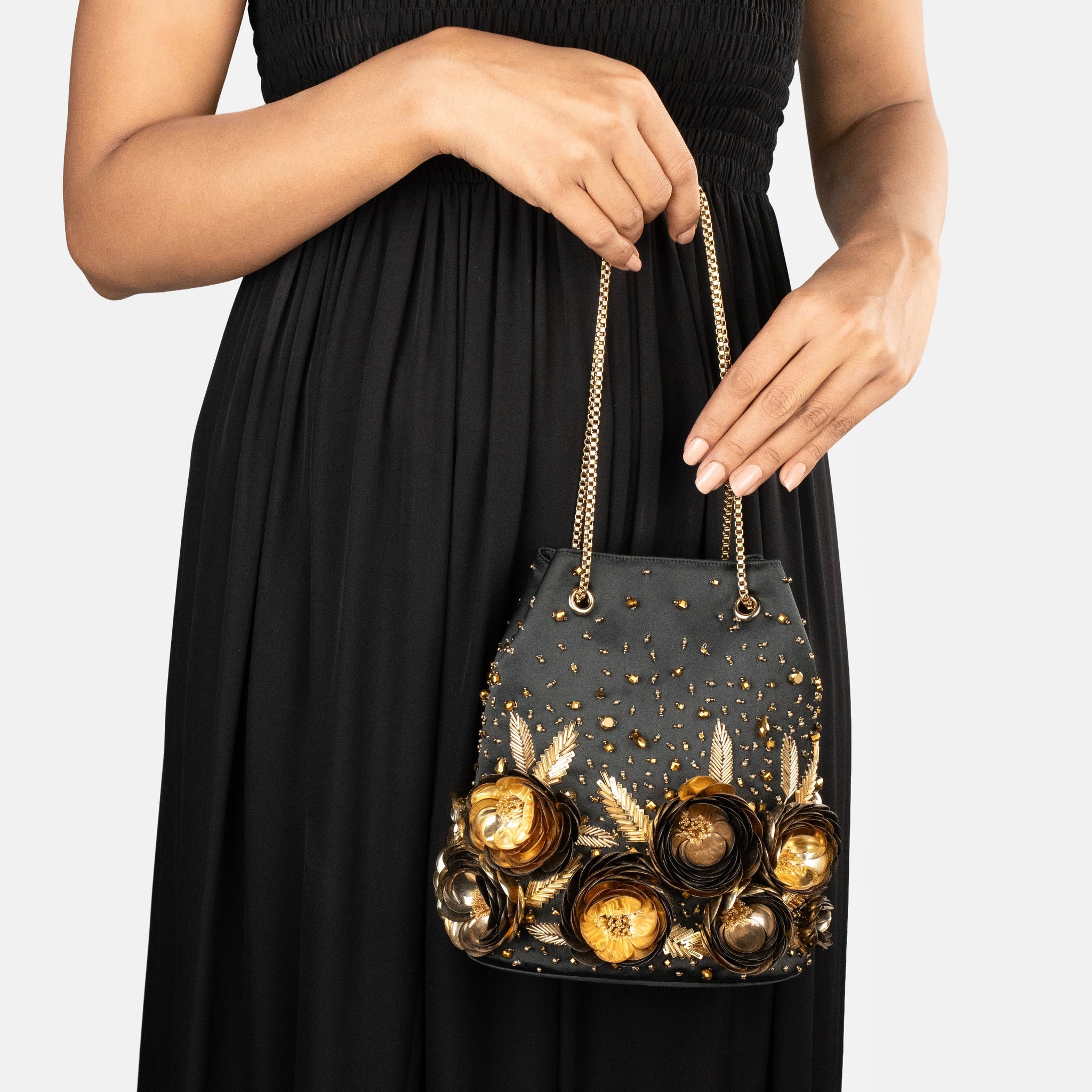 Bold and opulent, The Abbakka Bag in Gold epitomizes statement luxury through its masterful blend of artistry and modern sophistication. Meticulously handcrafted on a sumptuous silk base, it showcases intricate beadwork, lustrous metallic accents, and sculpted floral embellishments that create captivating depth and drama. This exquisite masterpiece commands attention with its refined craftsmanship and timeless luxurious appeal.