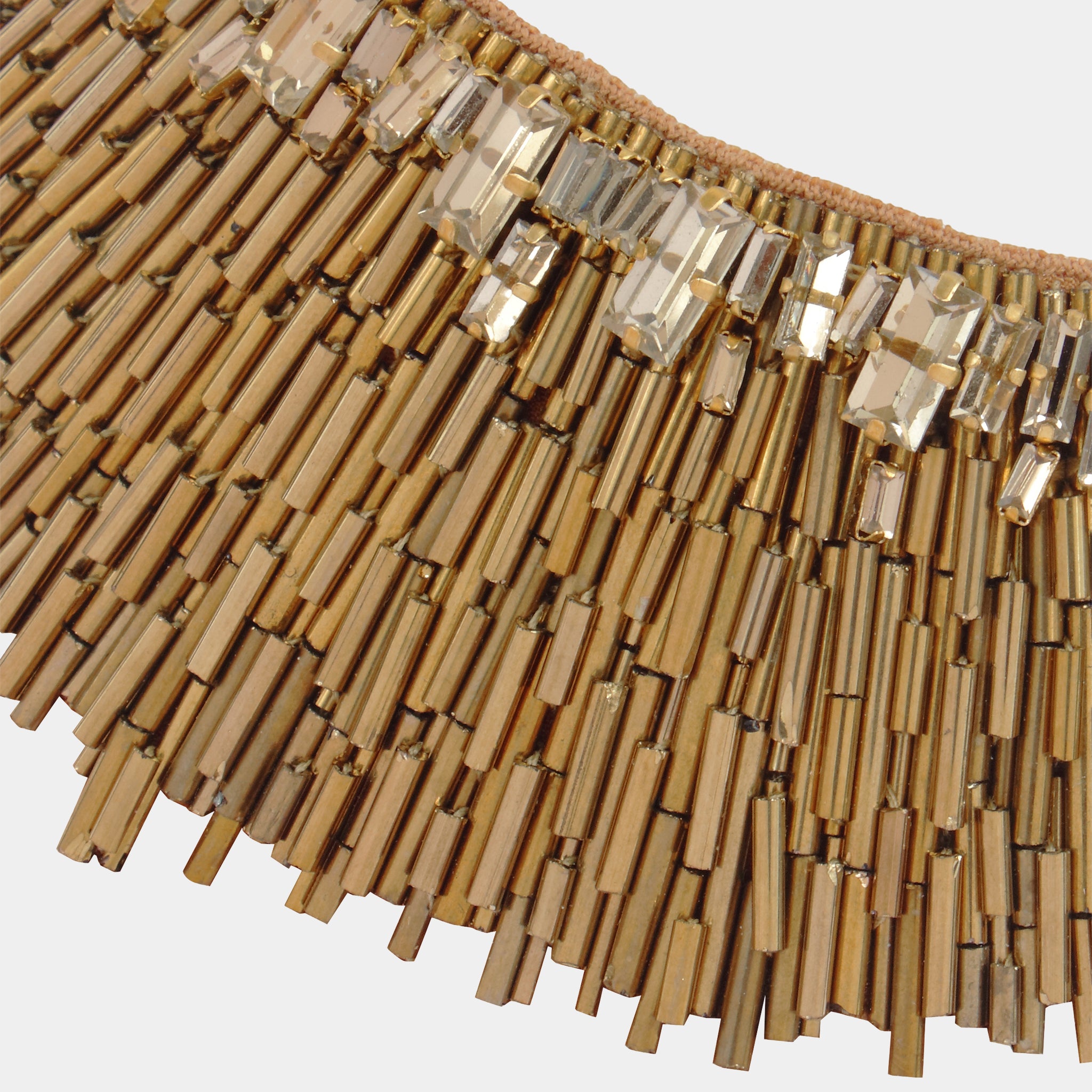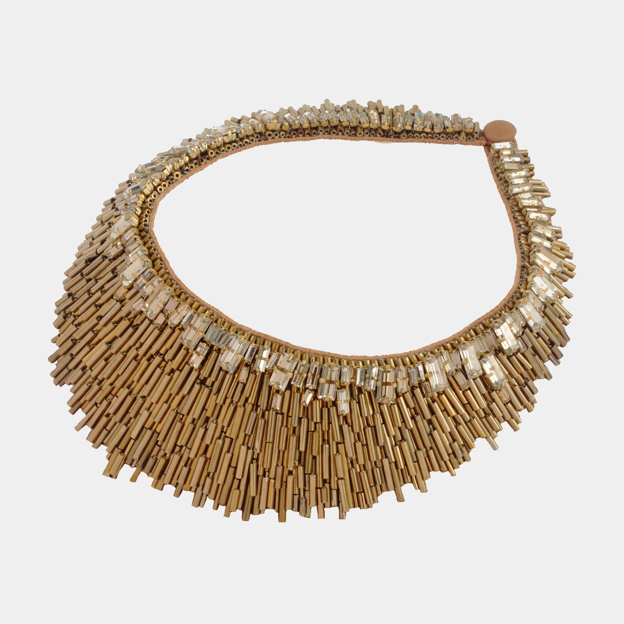 The Nargis Necklace in Gold epitomizes luminous sophistication with its radiant metallic allure and exquisite craftsmanship. Meticulously hand-embroidered with golden bugle beads and faceted crystals, it captures light beautifully, creating a brilliant interplay of texture and shine. This stunning masterpiece brings warmth and refinement that seamlessly elevate both contemporary silhouettes and timeless ensembles.