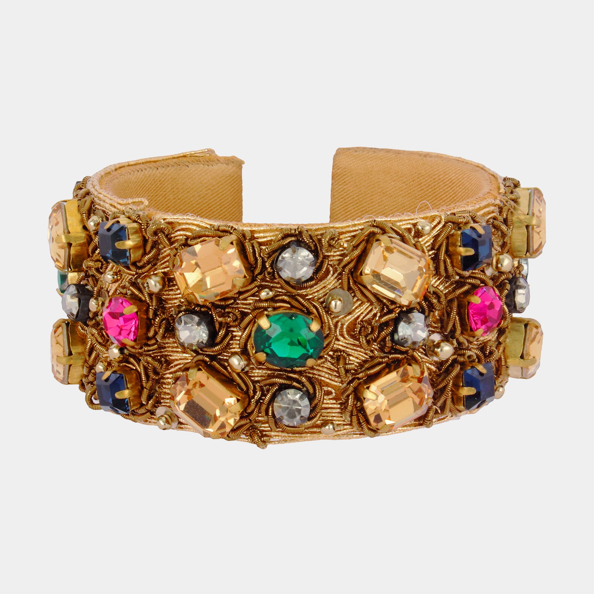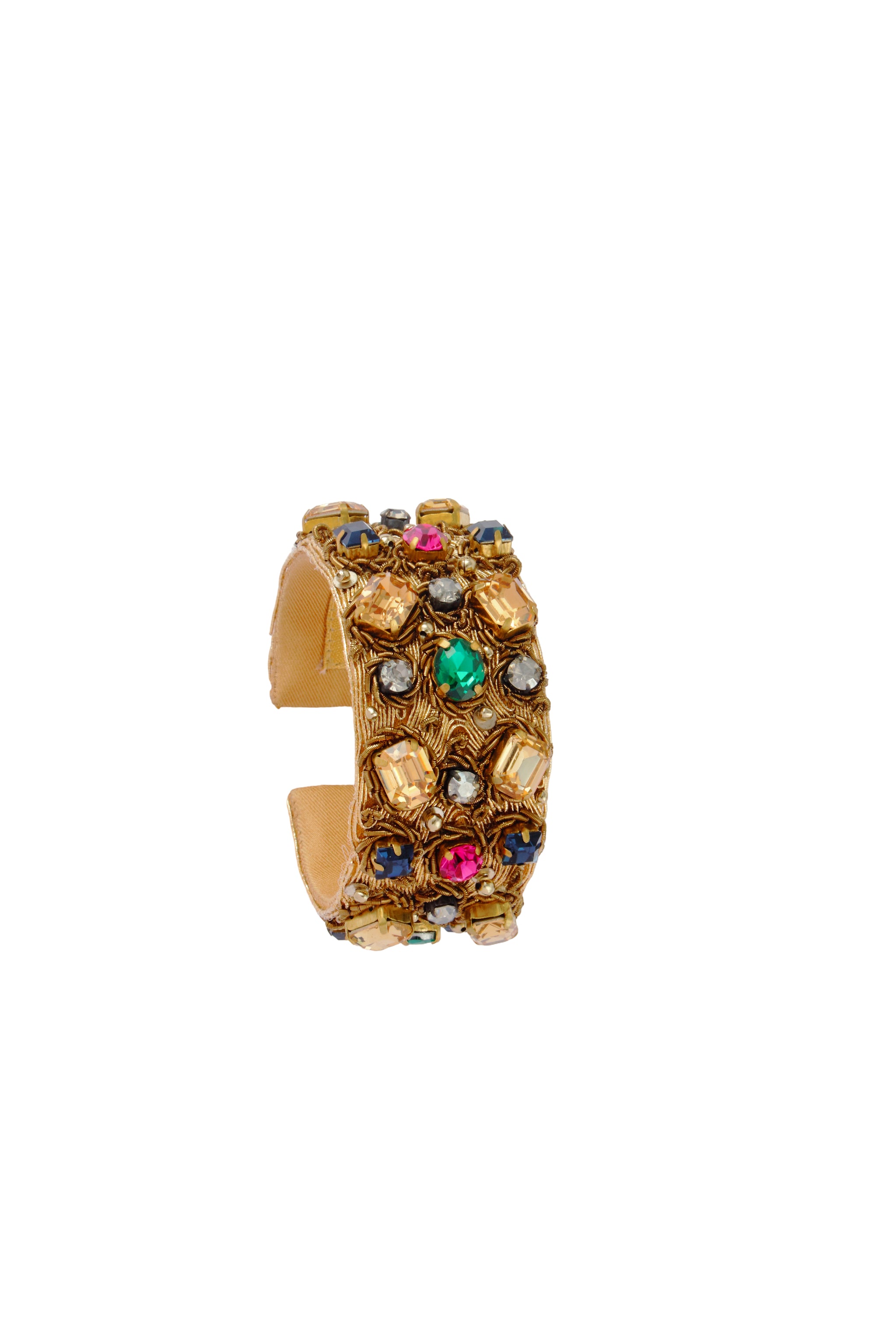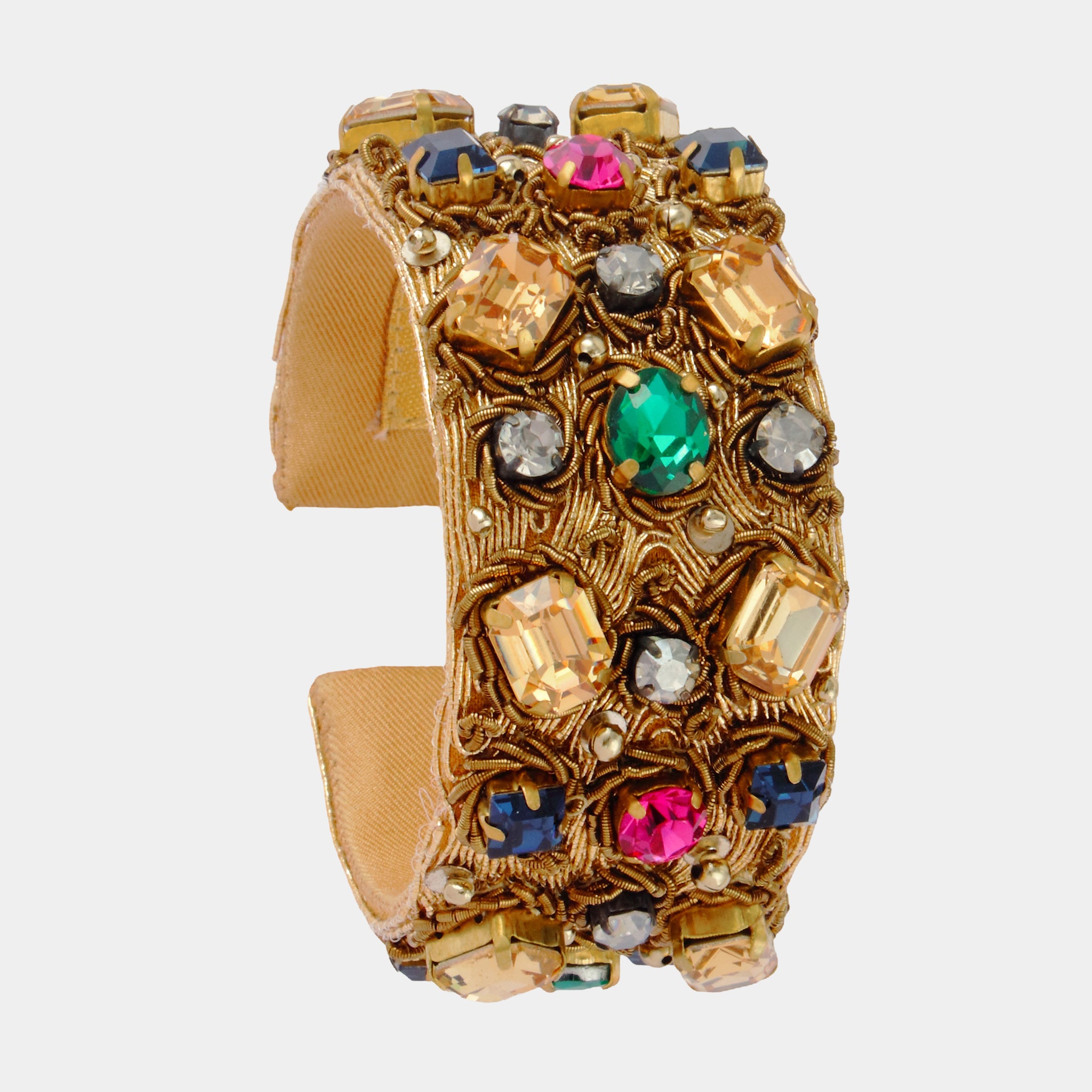 The Sita Cuff in Gold is an opulent masterpiece, crafted to embody radiance and timeless grandeur. Intricately hand-embroidered on a silk base, it is embellished with golden metallic threads and studded with luminous crystals in emerald, sapphire, ruby, and citrine tones. The warm gold finish highlights the richness of the gemstones. Its regal charm ensures it pairs beautifully with both traditional attire and modern silhouettes.