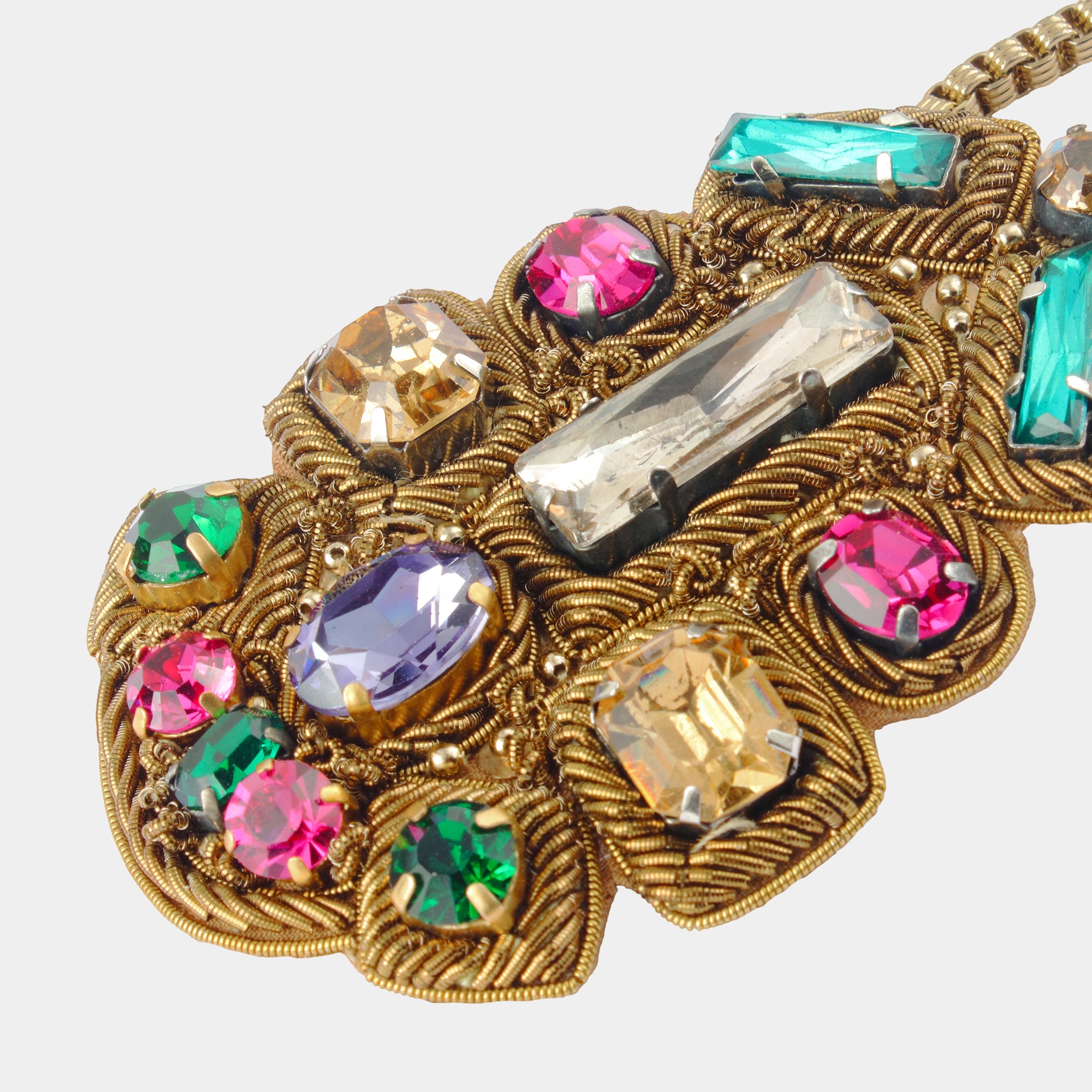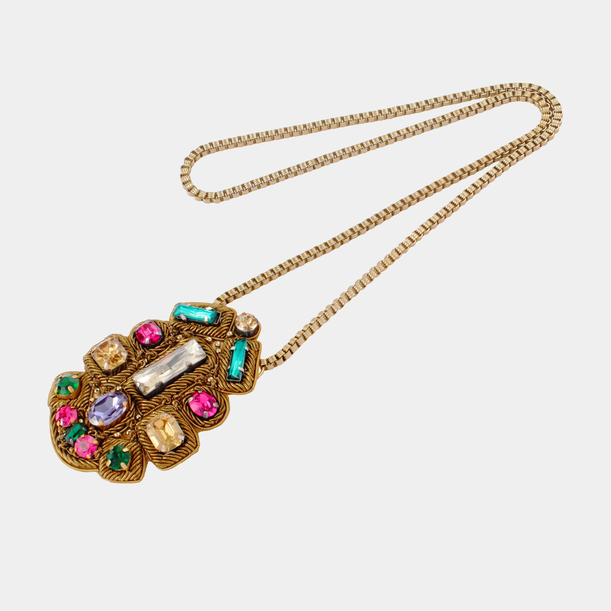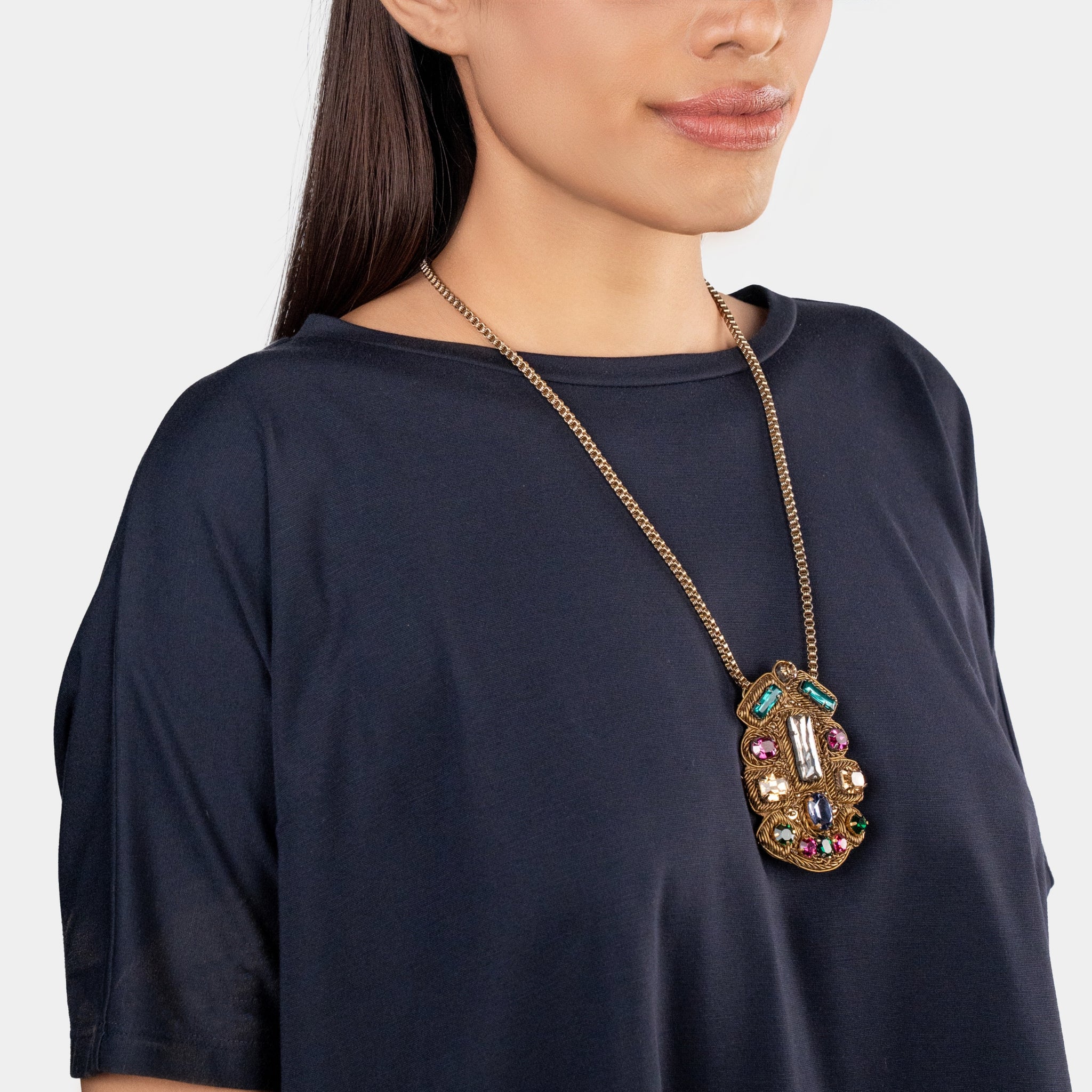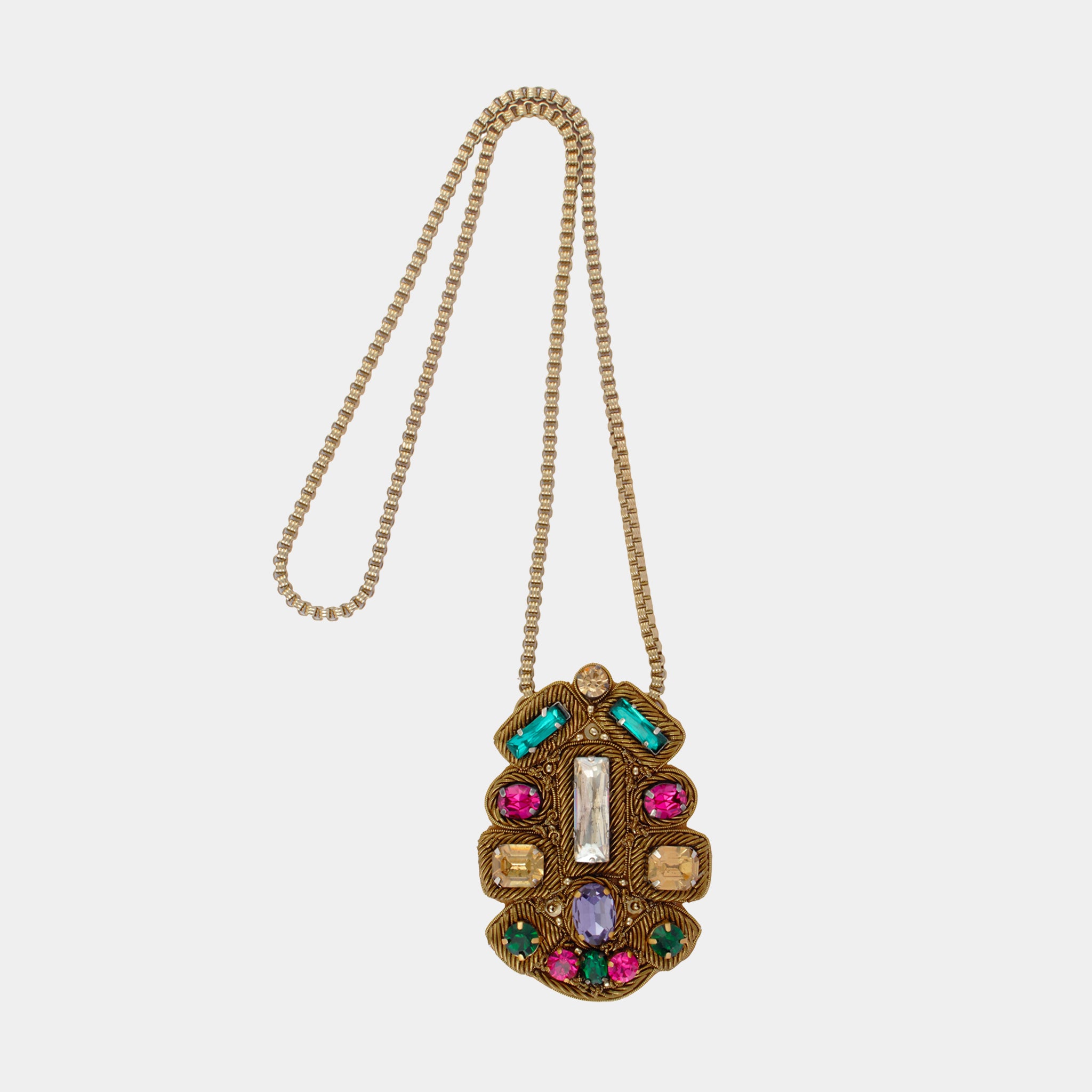 The Indira Pendant is a regal statement piece celebrating opulence and intricate craftsmanship. Set on an antique gold-toned base, it features a rich mix of emerald greens, royal blues, blush pinks, and clear baguette crystals arranged in an heirloom-inspired silhouette. The ornate detailing and jewel-like composition bring timeless elegance with a bold, contemporary edge.