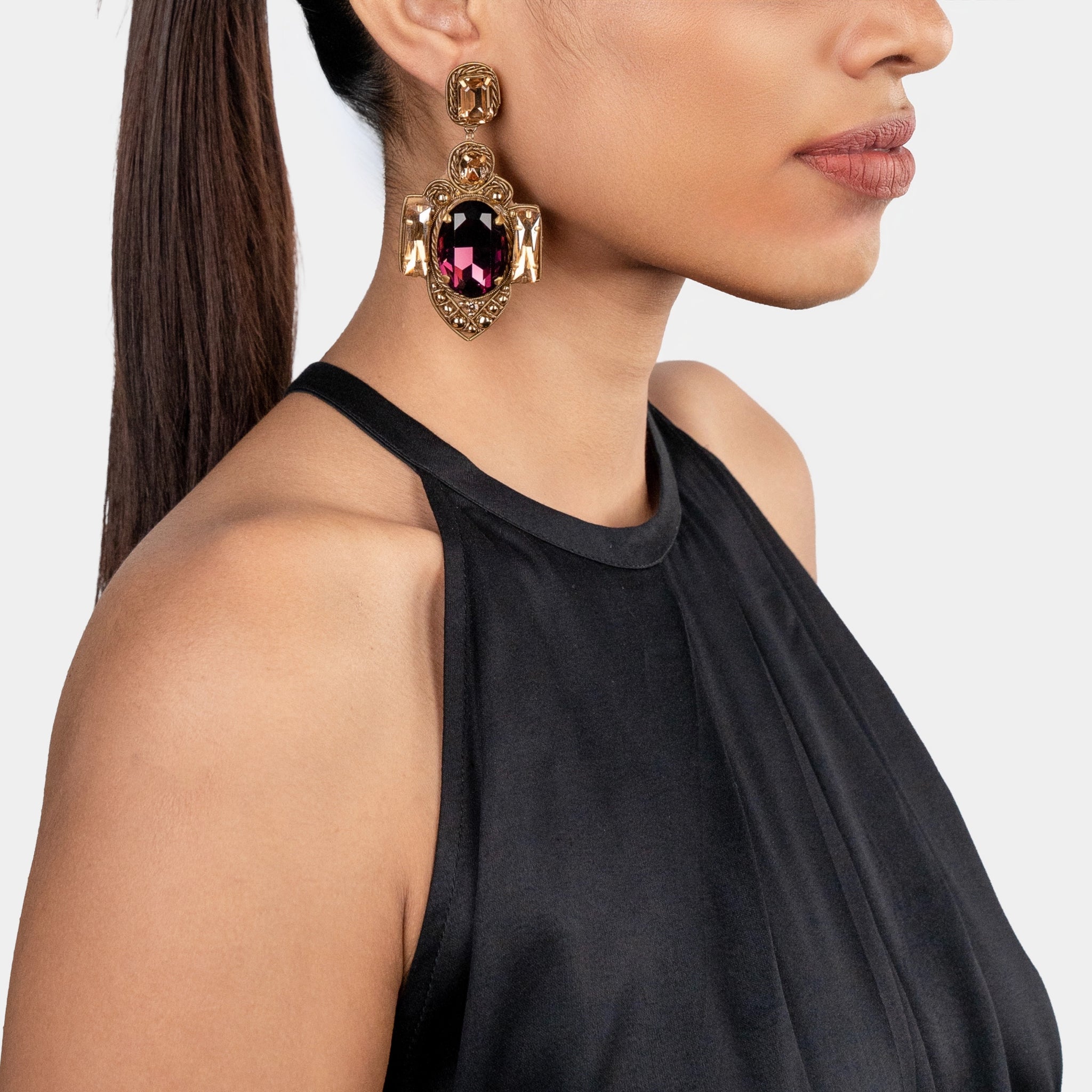 Embroidered with layered golden metalwork, these earrings feature a striking oval crimson centerpiece, beautifully accented with champagne and amber-toned crystals. The harmonious play of deep red and golden hues reflects light with every movement, making them a radiant statement piece.