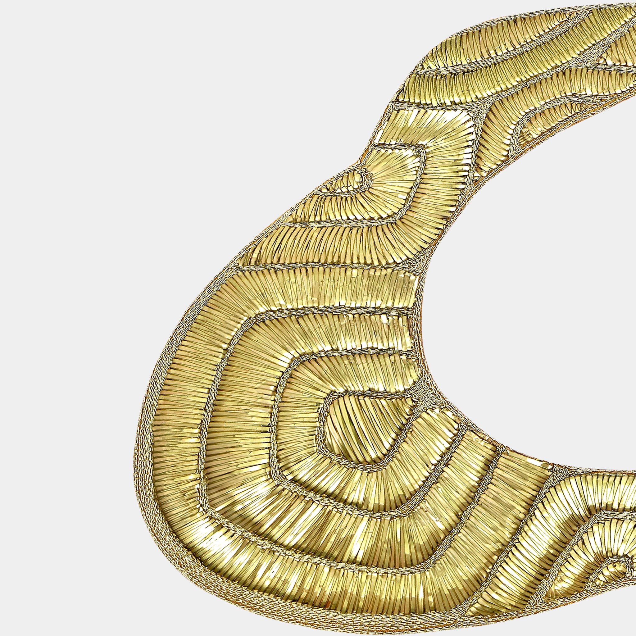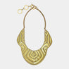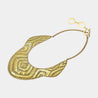 The Nilofer Necklace in Gold epitomizes bold sculptural artistry with its commanding presence and radiant metallic sophistication. Meticulously hand-embroidered on sumptuous silk base, it showcases precisely arranged golden bugle beads in rhythmic, geometric patterns that catch and reflect light with striking brilliance. This architectural masterpiece delivers refined luxury with contemporary allure and timeless elegance.