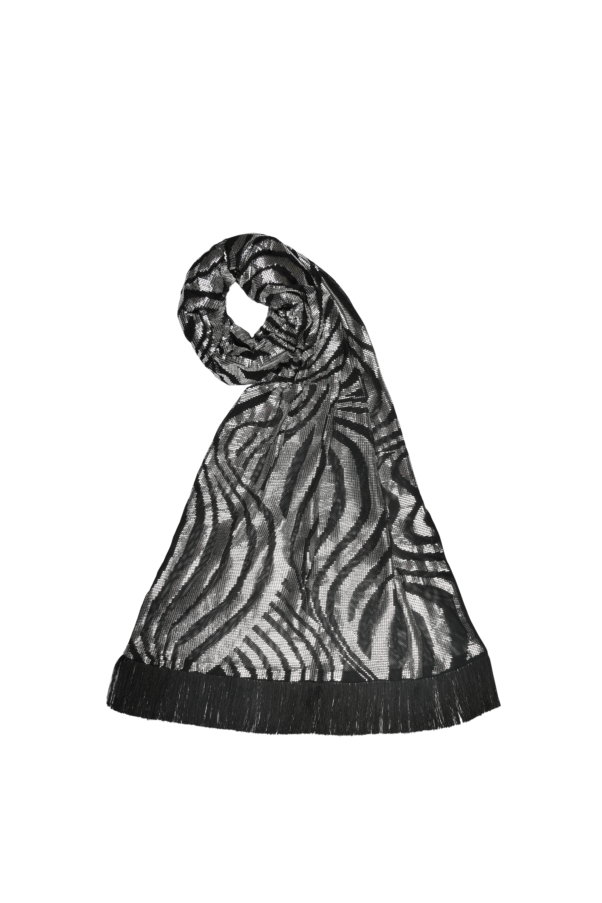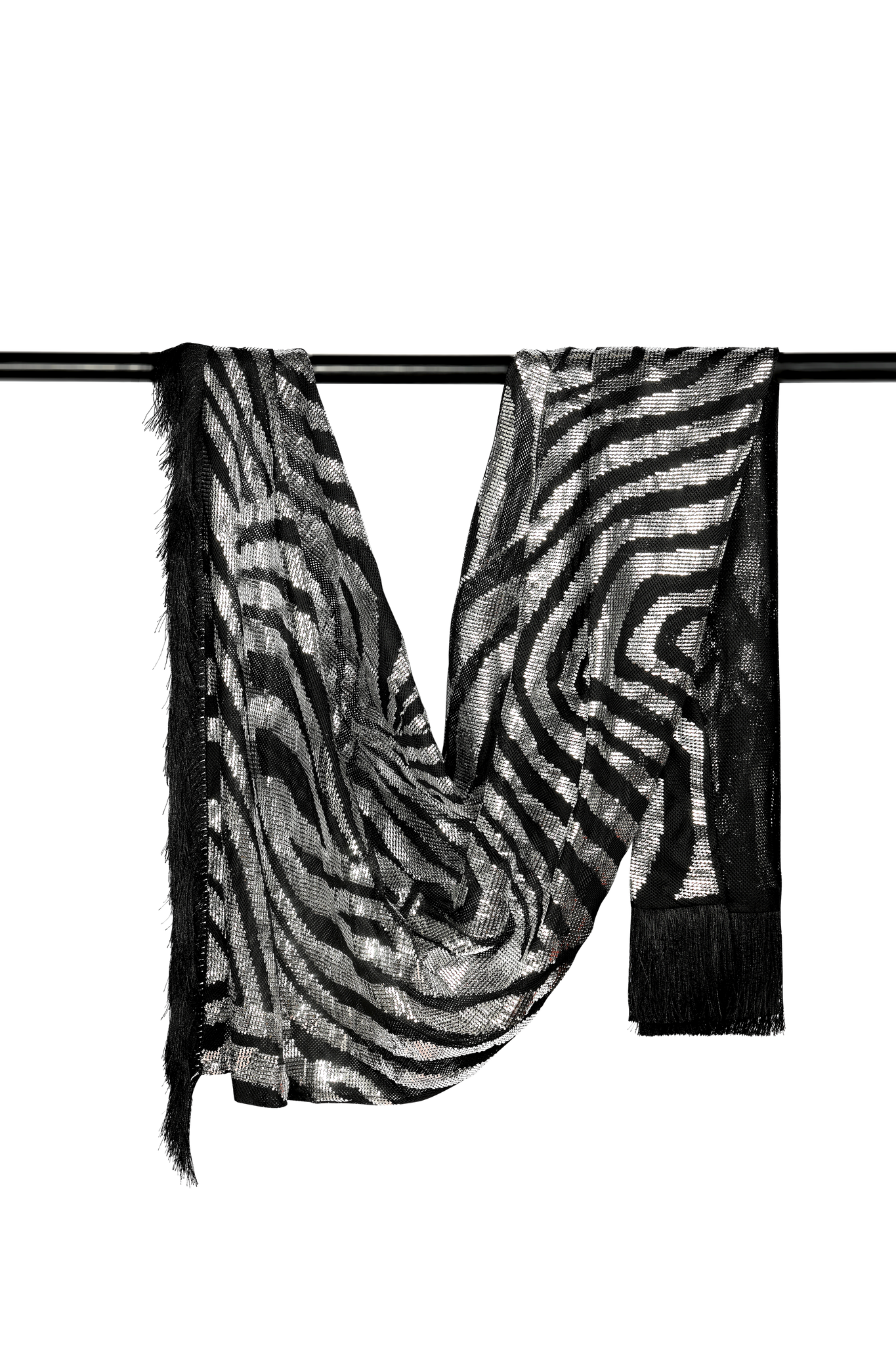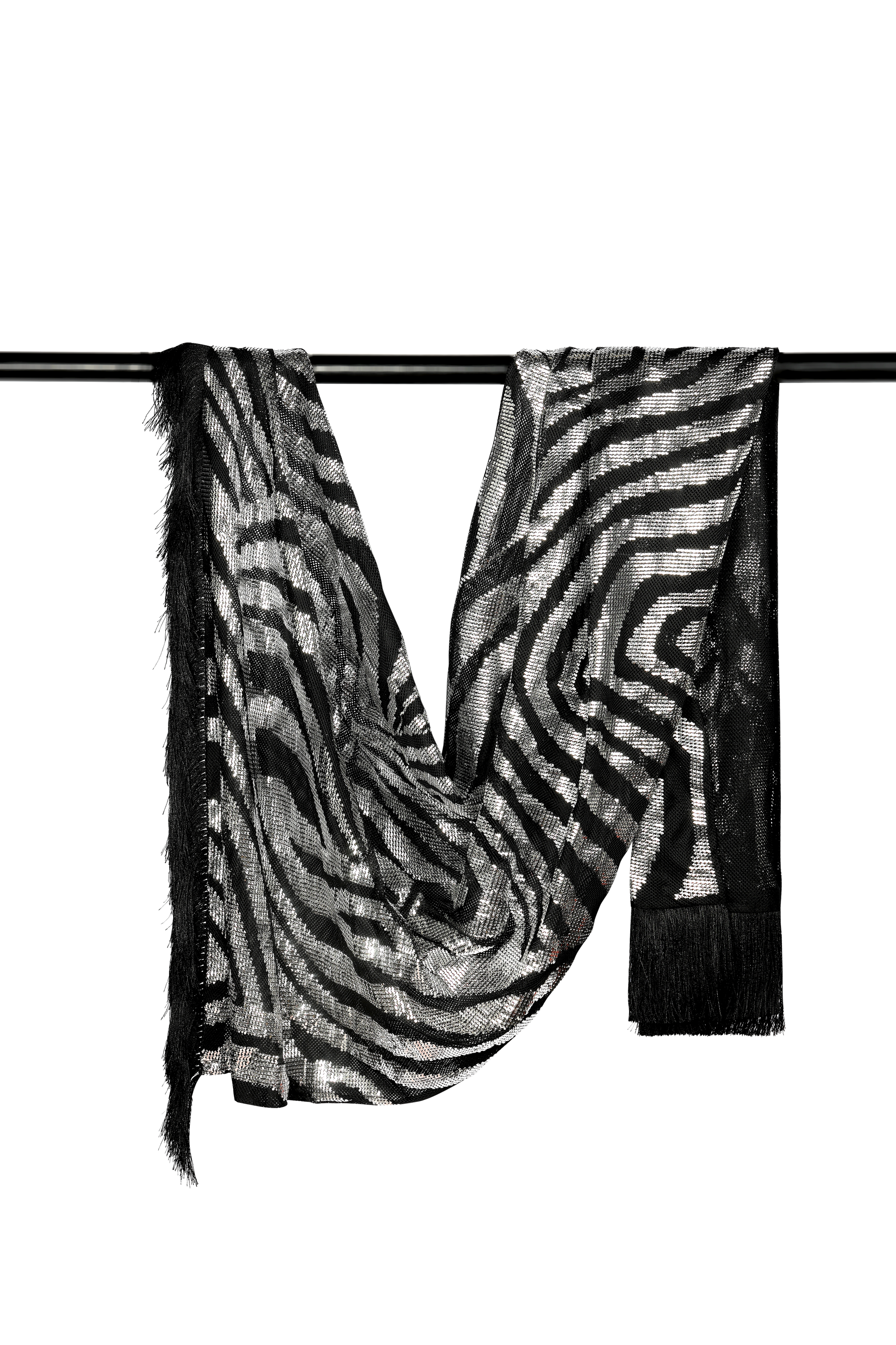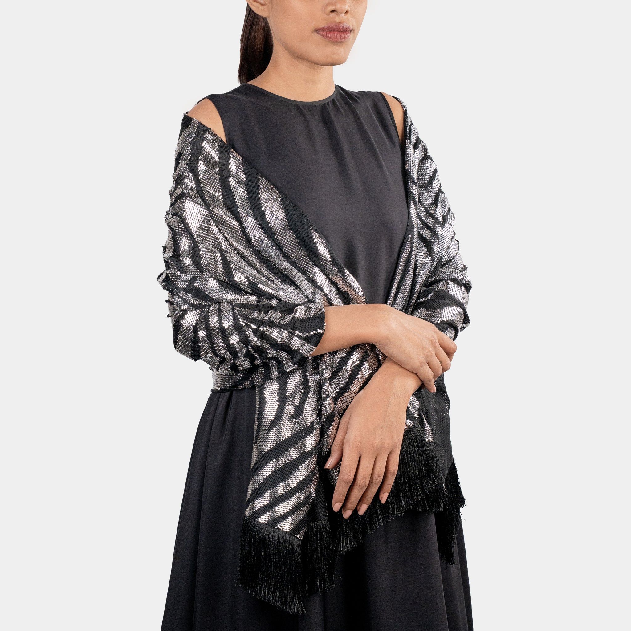 A bold statement piece crafted to dazzle with its luminous presence and contemporary edge. Designed on a fine silk base, it features striking silver metallic embroidery arranged in a dramatic linear pattern, reminiscent of modern art. The wrap is finished with delicate black fringe edges, adding both texture and movement to its sleek silhouette. Its interplay of shimmer and structure makes it a sophisticated addition to any luxury collection.