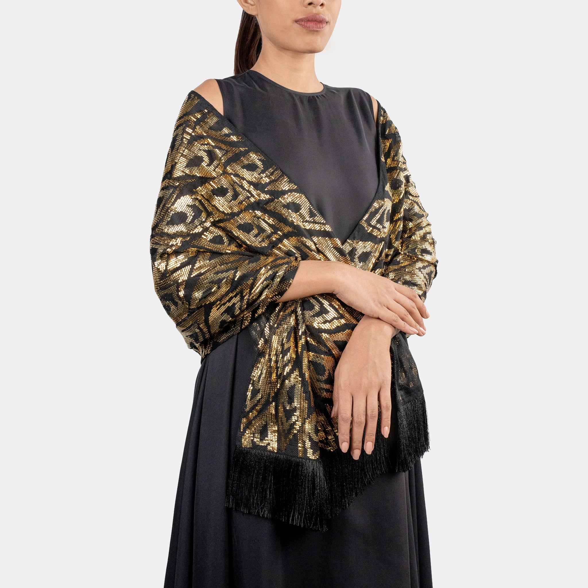 Elevate your ensemble with The Mor Wrap in Gold, a dazzling expression of artisanal finesse. Handcrafted with meticulous detail, this wrap features an intricate geometric pattern created using radiant gold and bronze metal thread on a deep black mesh base. The shimmering surface catches the light with every movement, while soft black fringe edging adds a touch of dramatic flair.