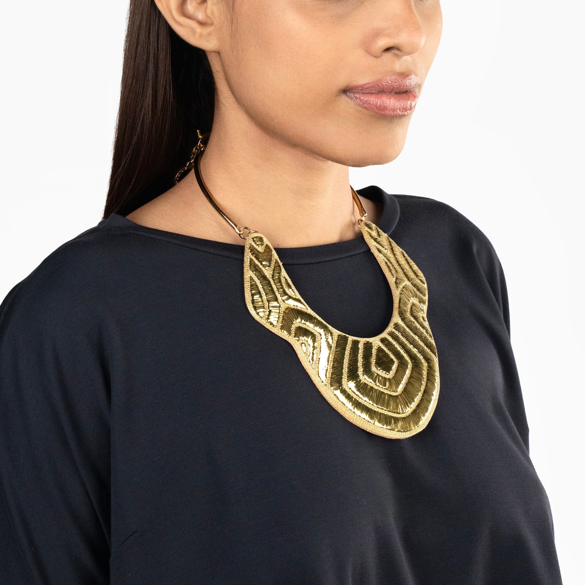 The Nilofer Necklace in Gold epitomizes bold sculptural artistry with its commanding presence and radiant metallic sophistication. Meticulously hand-embroidered on sumptuous silk base, it showcases precisely arranged golden bugle beads in rhythmic, geometric patterns that catch and reflect light with striking brilliance. This architectural masterpiece delivers refined luxury with contemporary allure and timeless elegance.