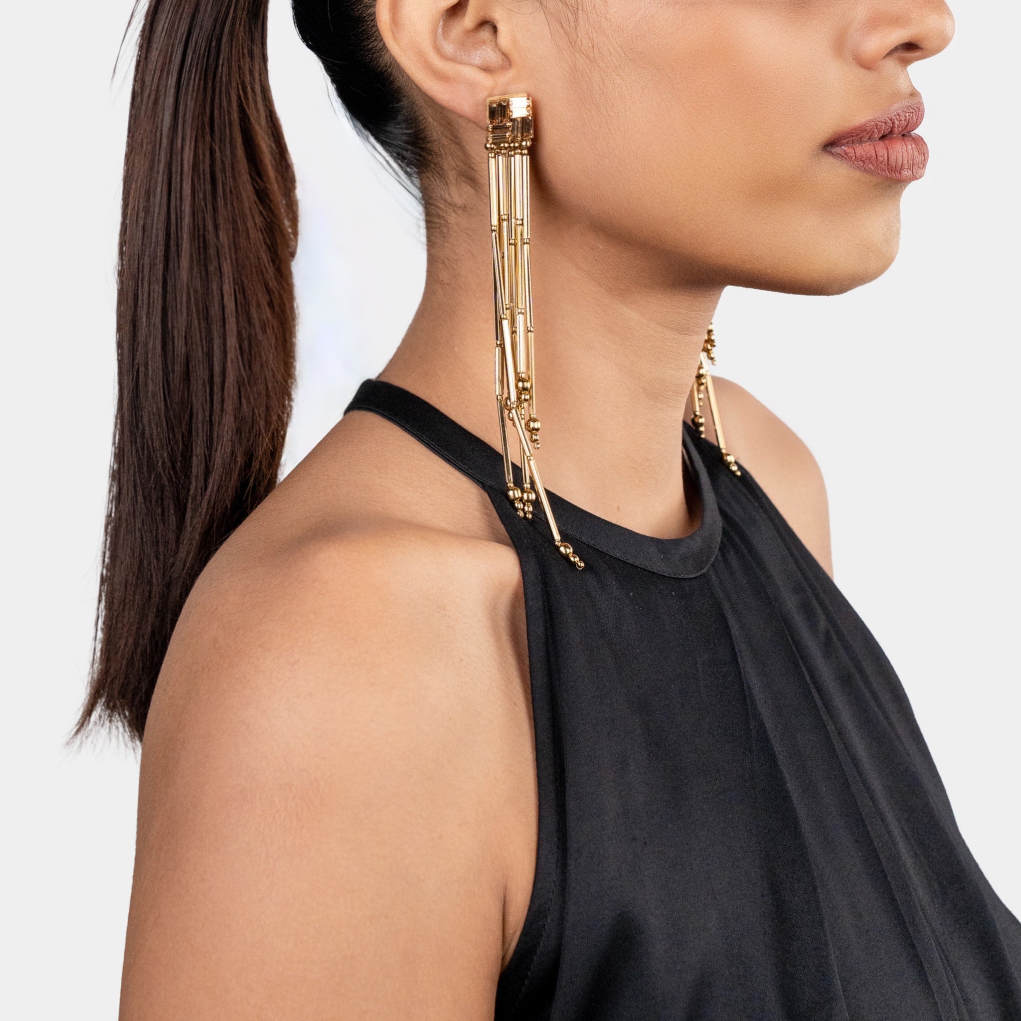 Radiant elegance defines the Devika Danglers in Gold, bringing luminous sophistication to any ensemble with their brilliant metal finish and graceful cascading silhouette. Crafted with layered metallic pipes and sparkling crystals, these striking statement earrings create captivating movement and timeless elegance. This exquisite design embodies luxury craftsmanship and refined glamour with sophisticated contemporary appeal.