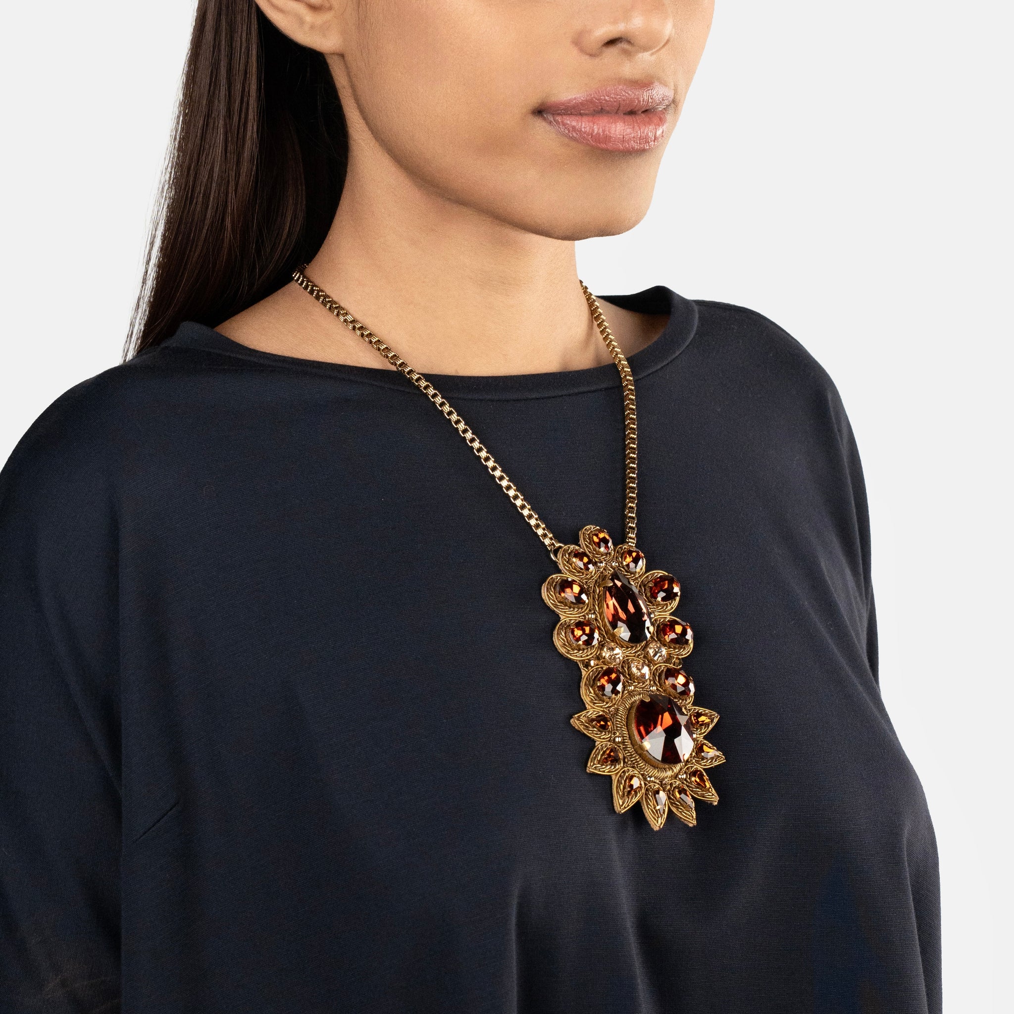 The Amber Pendant in Gold radiates a rich, jewel-toned elegance with its deep amber crystals and antique-inspired craftsmanship. Suspended on a sleek gold-toned chain, the striking pendant features a bold arrangement of faceted amber stones surrounded by intricate metal detailing, evoking timeless opulence. Its warm hues and statement design make it an instant focal point for any outfit, embodying refined artistry and heritage allure.