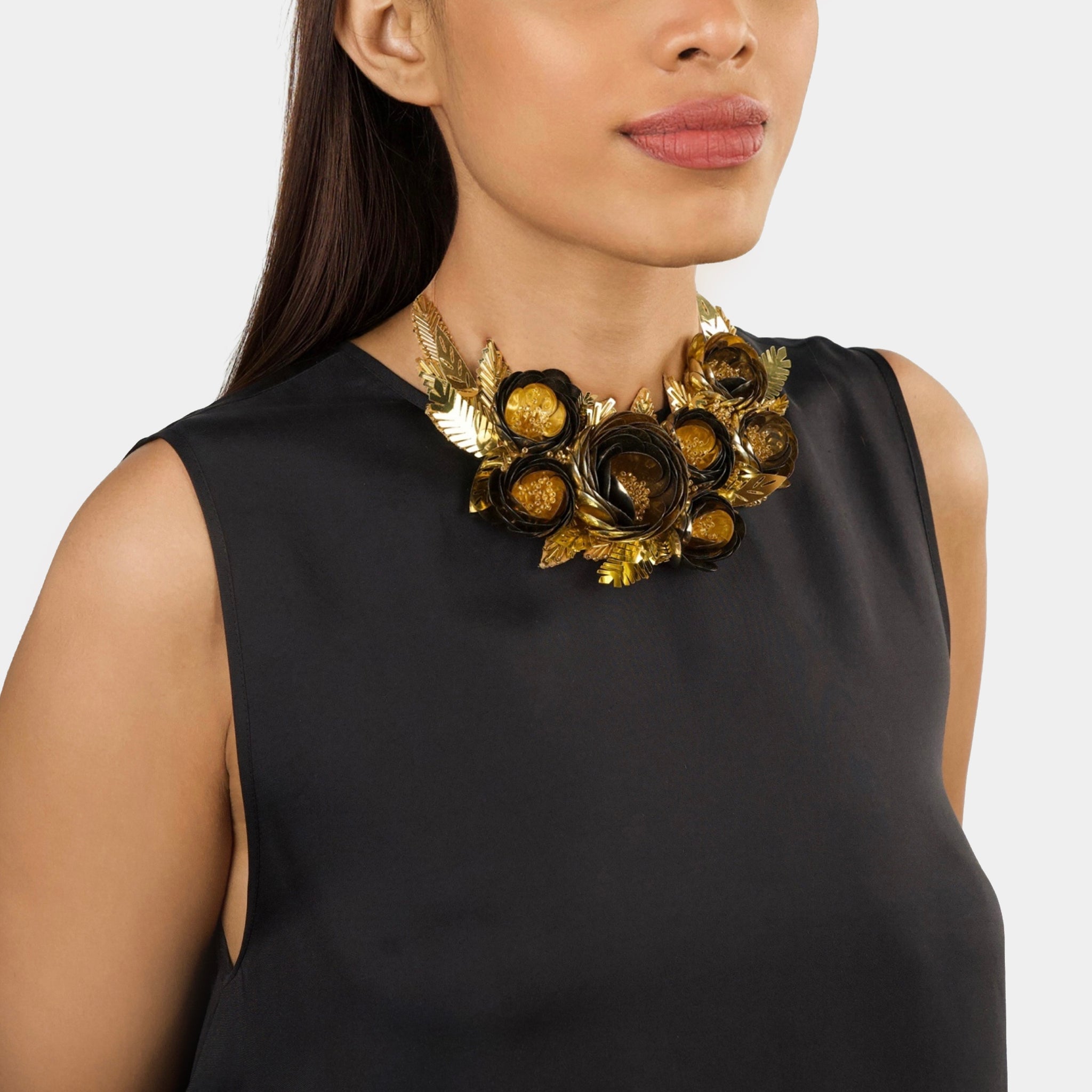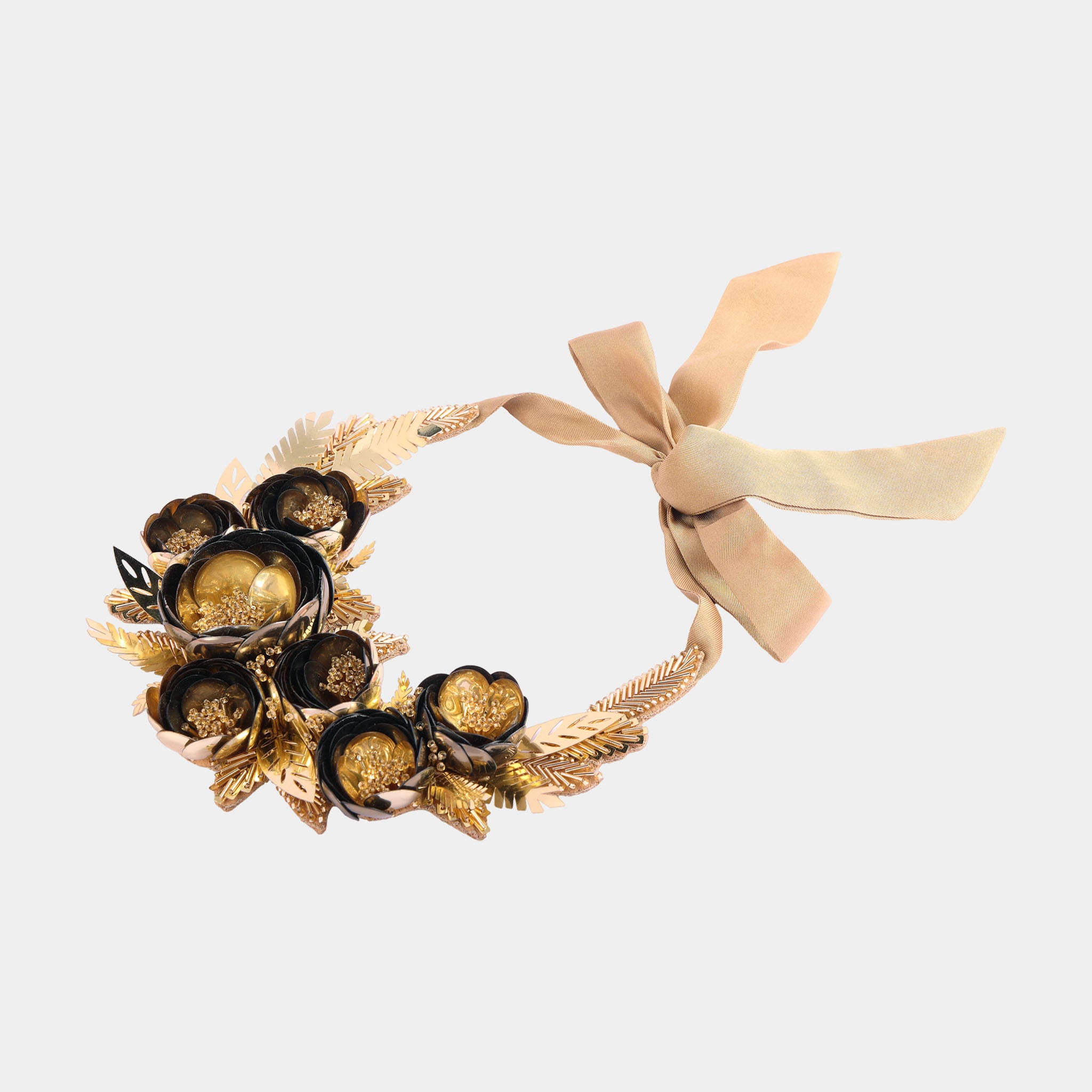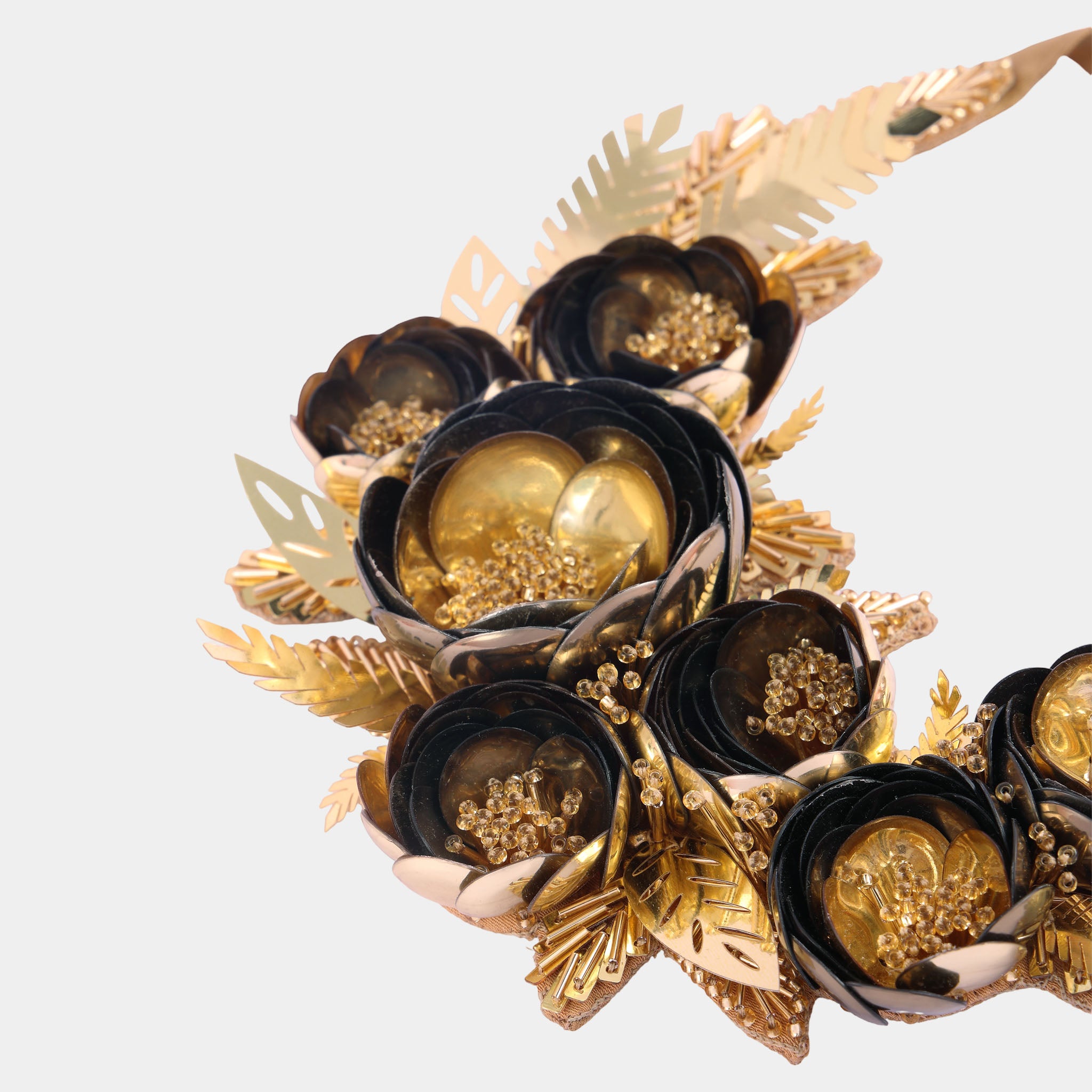 Intricately hand-embroidered with sculpted floral blooms in rich amber gold and soft champagne hues, this piece is adorned with shimmering seed bead clusters and delicately layered metallic foliage. The interplay of warm tones and lustrous finishes creates a radiant glow that enhances any ensemble with timeless elegance.