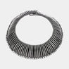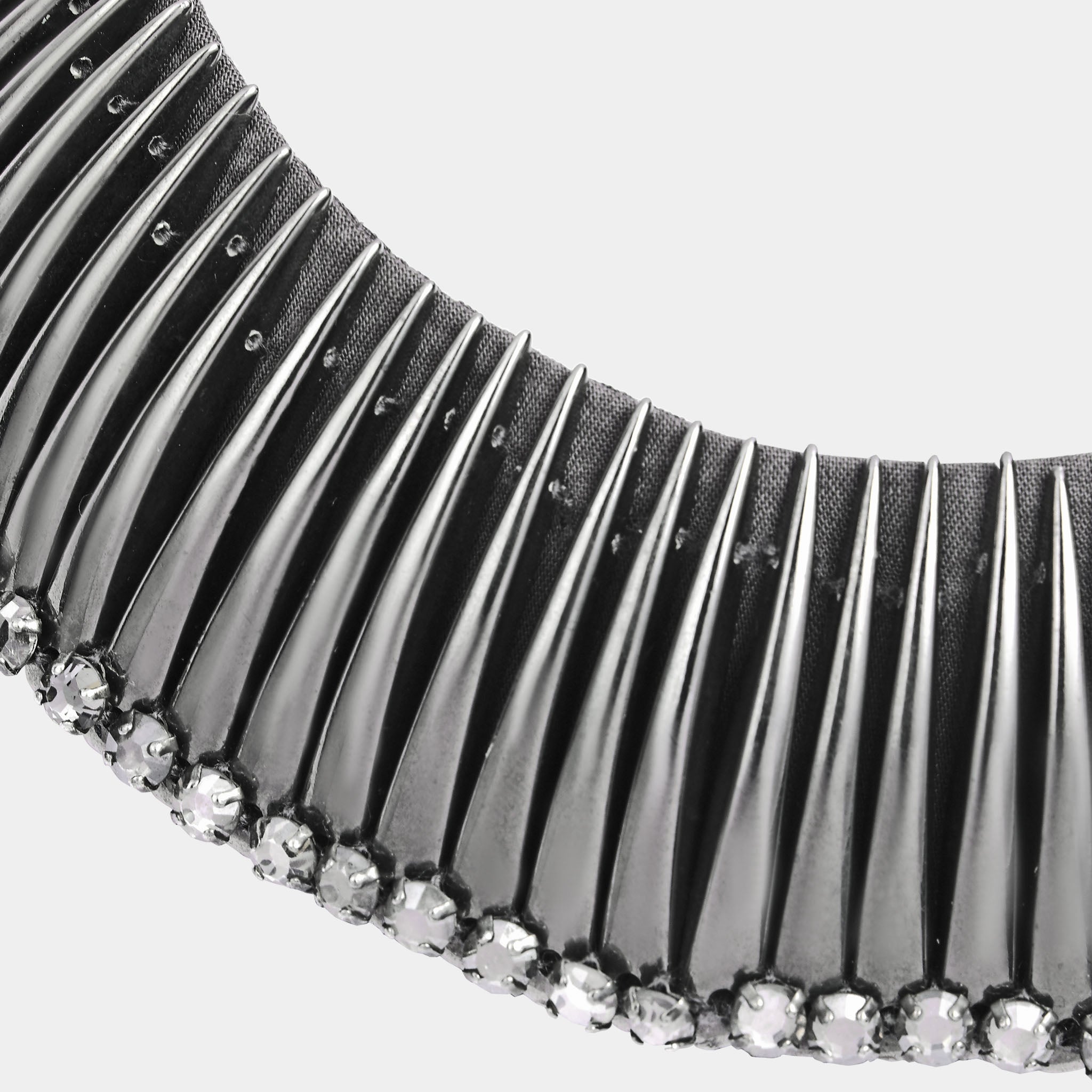 The Avanti Necklace in Gunmetal epitomizes depth and contemporary allure with its commanding presence and sophisticated metallic appeal. Meticulously crafted on sumptuous silk base, it combines bold gunmetal-toned metallic leaves with glistening black diamond baguette crystals for a dramatic yet refined aesthetic. This striking masterpiece delivers unforgettable luxury that enhances both sleek modern silhouettes and statement evening ensembles with timeless sophistication.