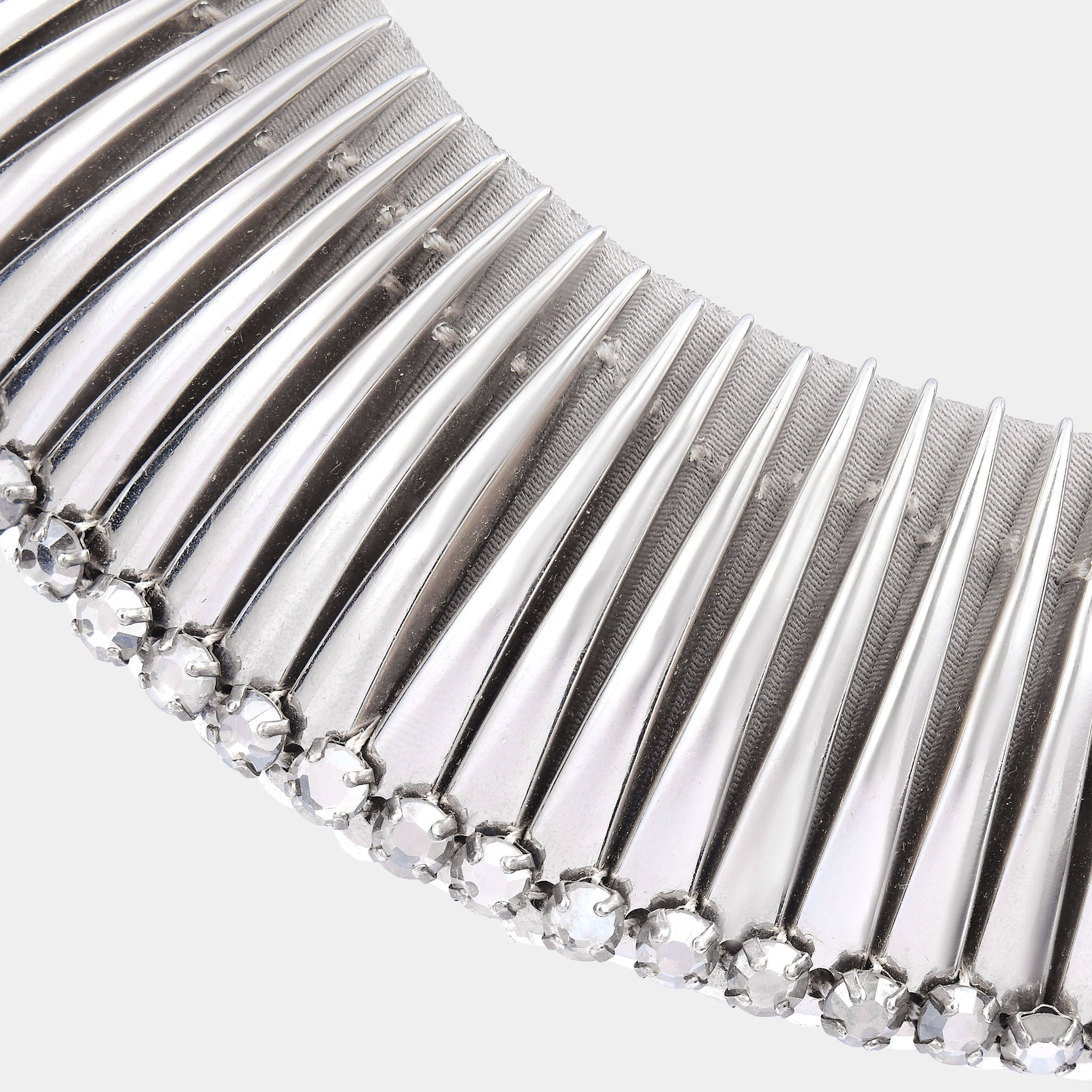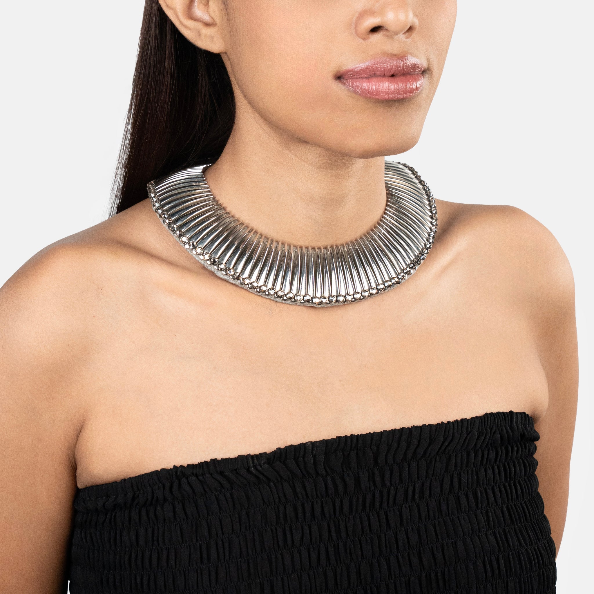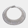 The Avanti Necklace in Silver epitomizes modern elegance with its bold craftsmanship and commanding metallic presence. Meticulously hand-embroidered on sumptuous silk base, it showcases sleek metallic leaves in alternating sizes, outlined with baguette-cut crystals that shimmer with every movement. This striking masterpiece features a powerful silhouette with secure button closure, delivering versatile luxury that effortlessly complements both tailored eveningwear and classic ensembles.
