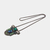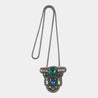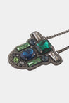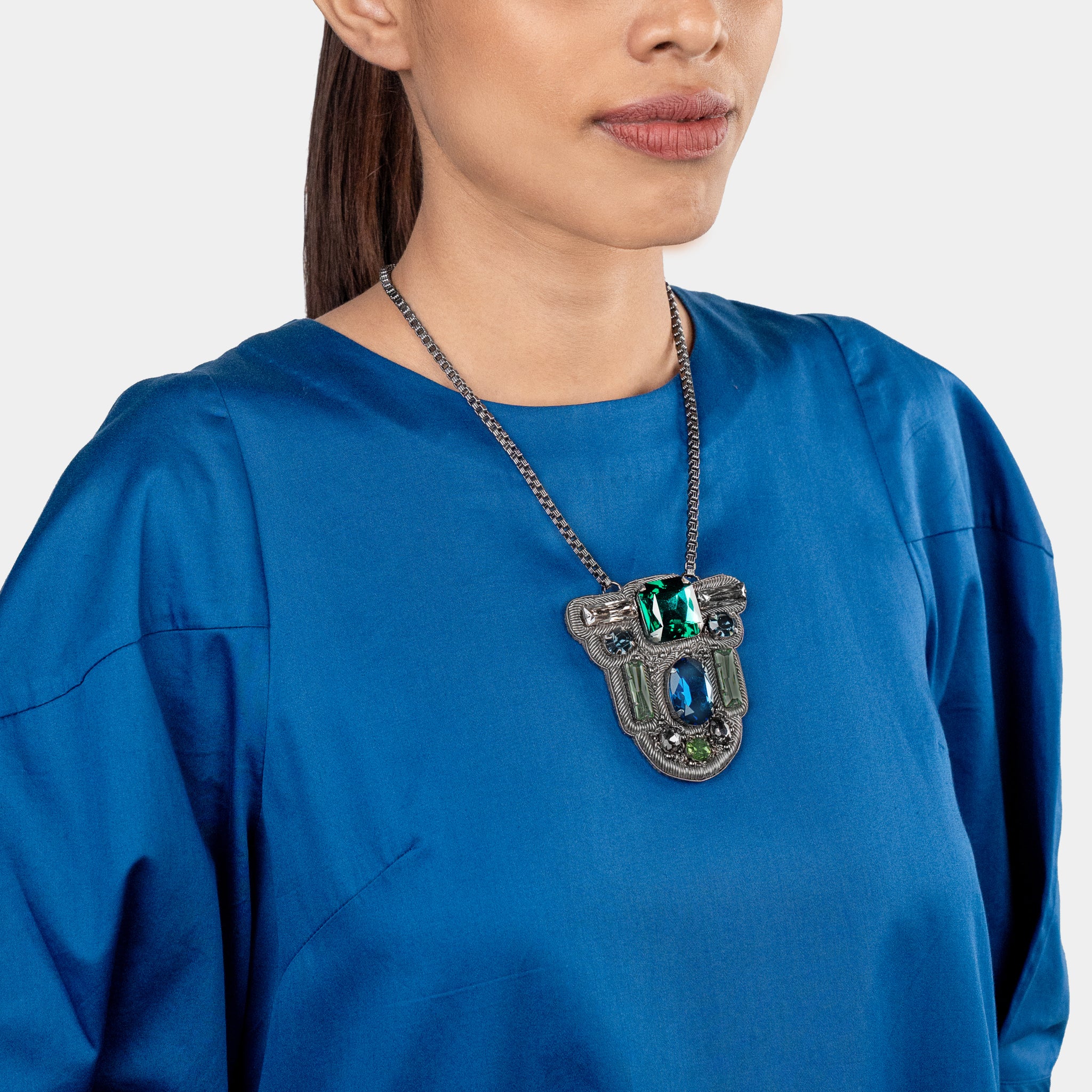The Diya Pendant in Gunmetal exudes bold refinement with its cool-toned, high-contrast palette. Set on an antique silver base, the pendant features emerald green, sapphire blue, and icy mint crystals arranged in a striking symmetrical pattern. The sleek gunmetal chain enhances the edgy elegance of the piece, making it a go-to accessory for those who favor a sophisticated, contemporary edge.