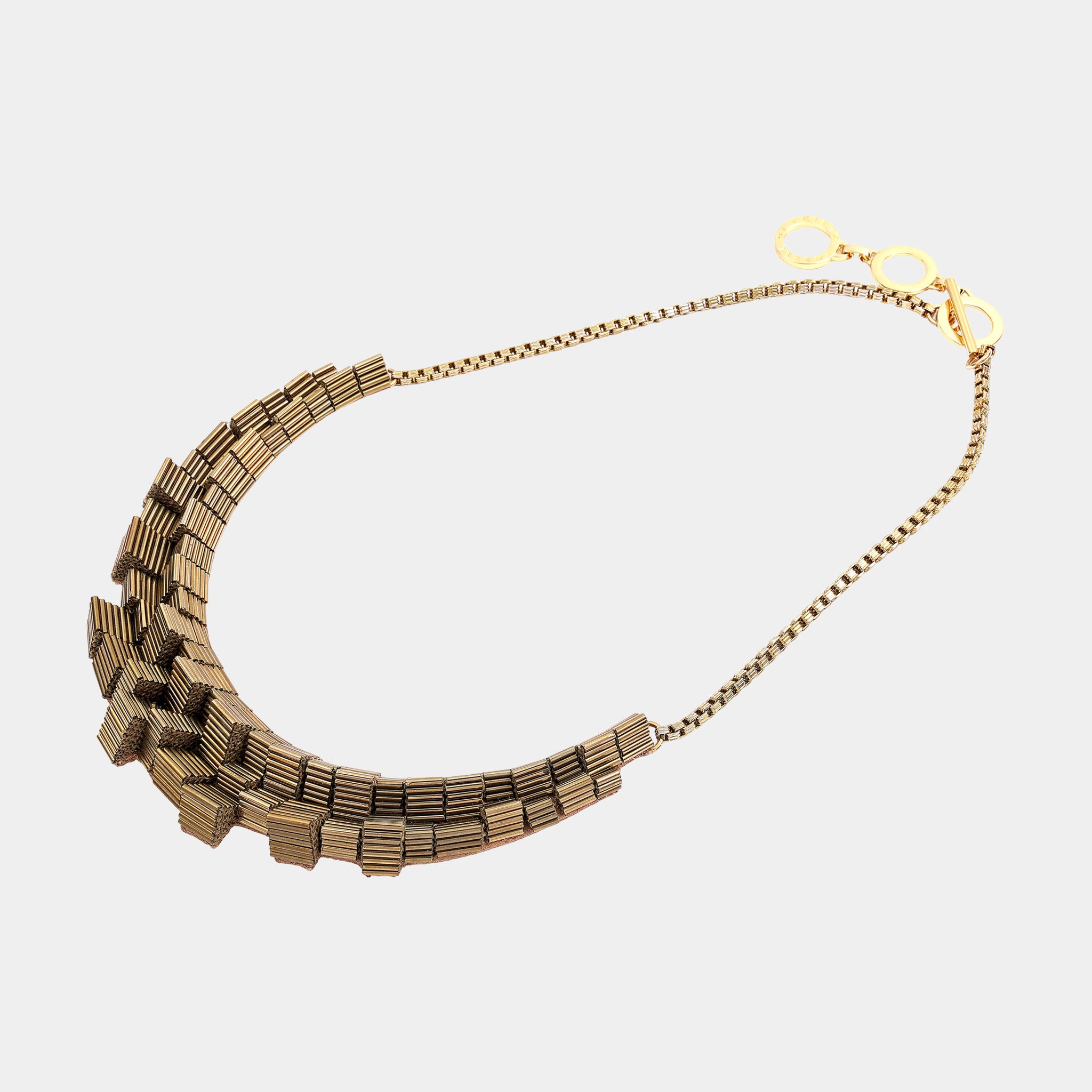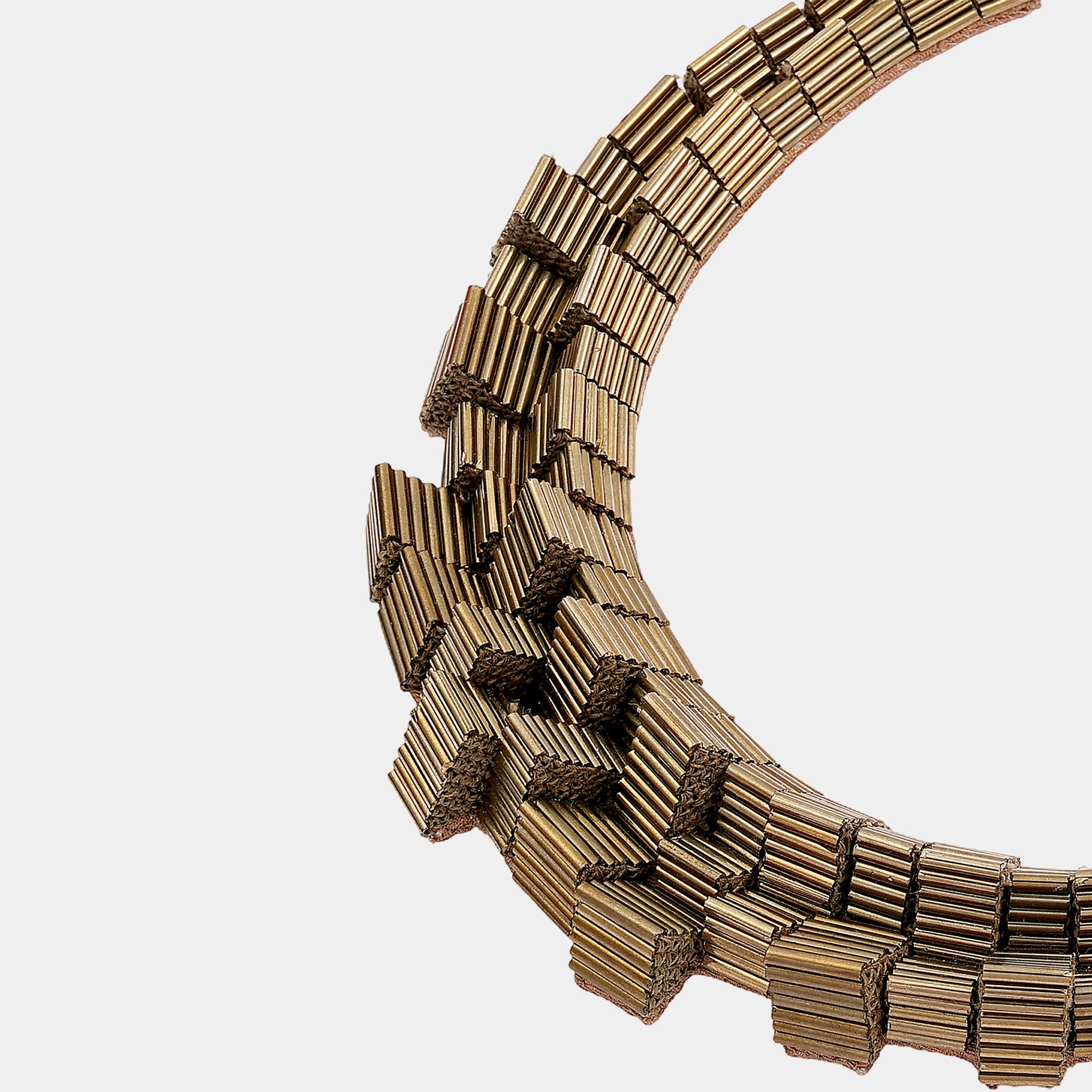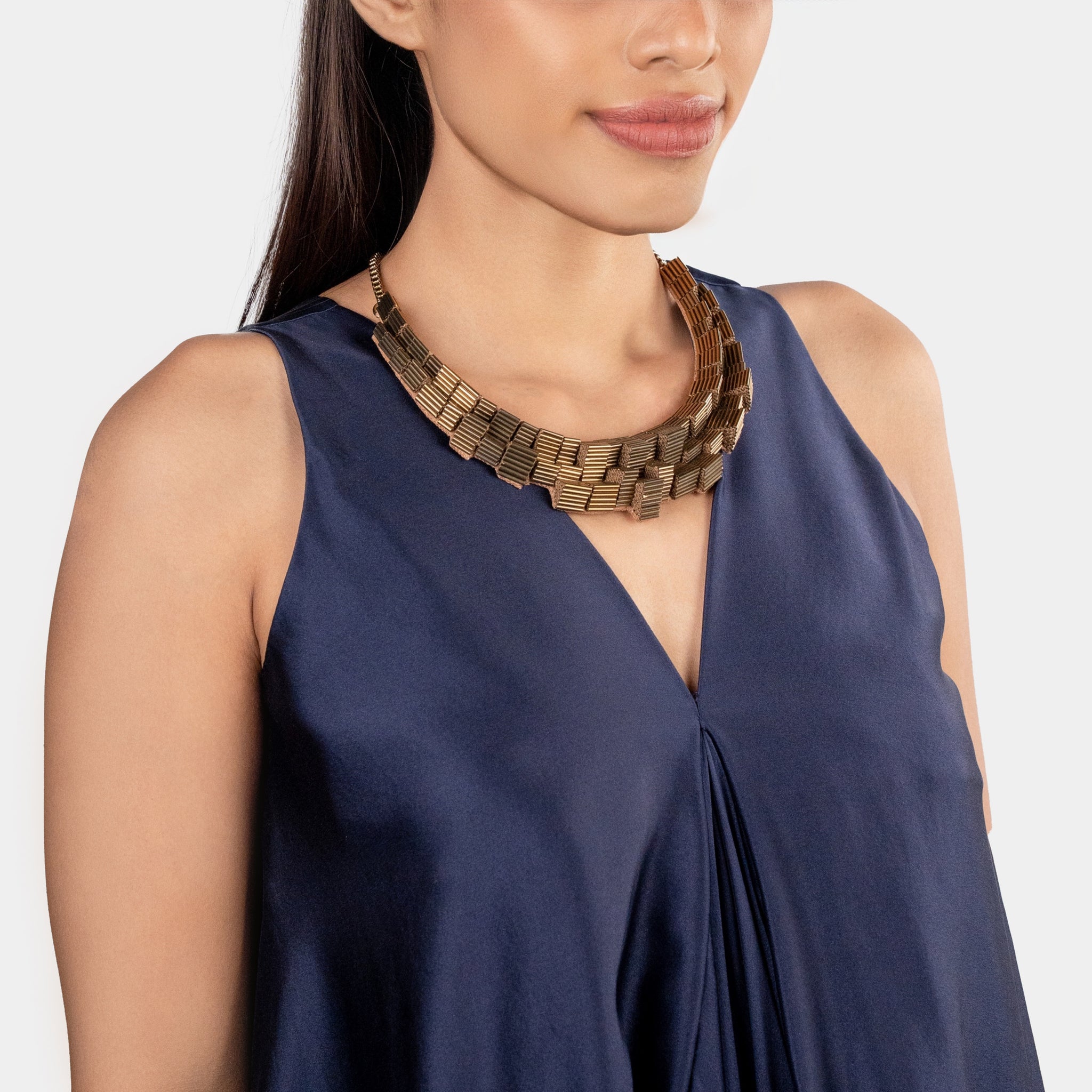 The Gayatri Necklace in Golden epitomizes radiant elegance and strength with its shimmering metallic sophistication and captivating presence. Meticulously hand-embroidered with gleaming golden bugle beads, it reflects light beautifully, creating a warm and mesmerizing glow with every movement. This timeless masterpiece enhances both structured modern ensembles and sophisticated evening styles with versatile opulence and contemporary appeal.