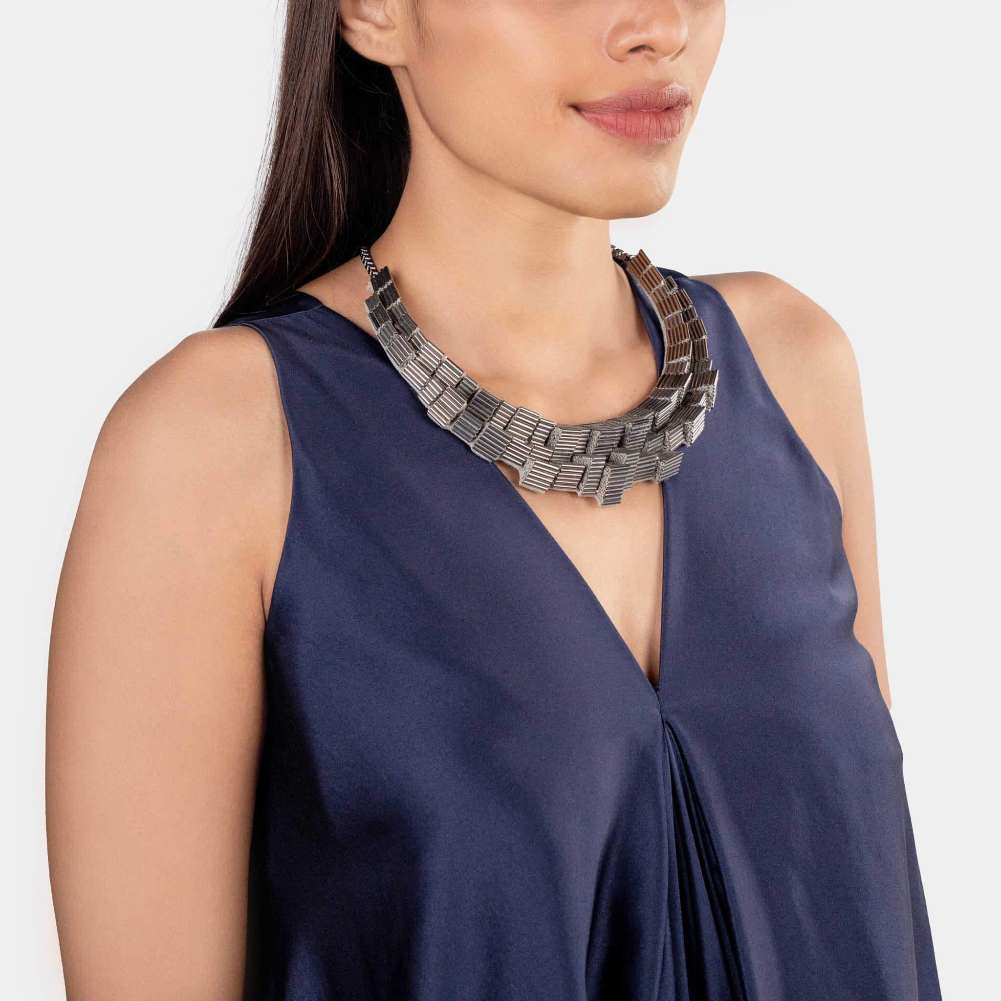 The Gayatri Necklace in Gunmetal epitomizes bold modern luxury with its commanding architectural inspiration and sophisticated metallic presence. Meticulously hand-embroidered with precision using structured layers of metallic bugle beads in deep gunmetal tones, creating a sculptural silhouette that balances strength with elegance. This distinctive masterpiece elevates contemporary looks with striking edge, enhancing both monochrome sophistication and statement ensembles with timeless allure.