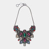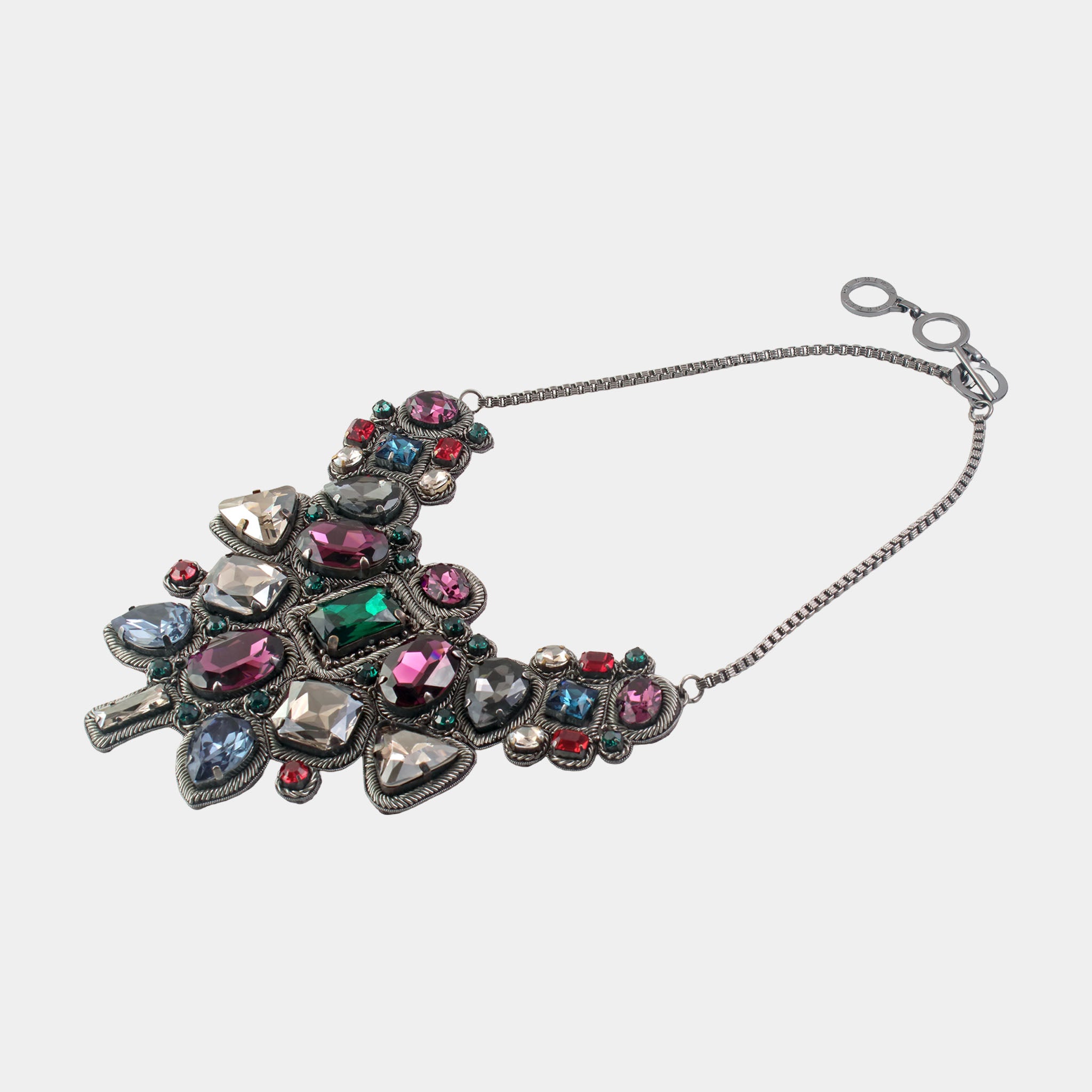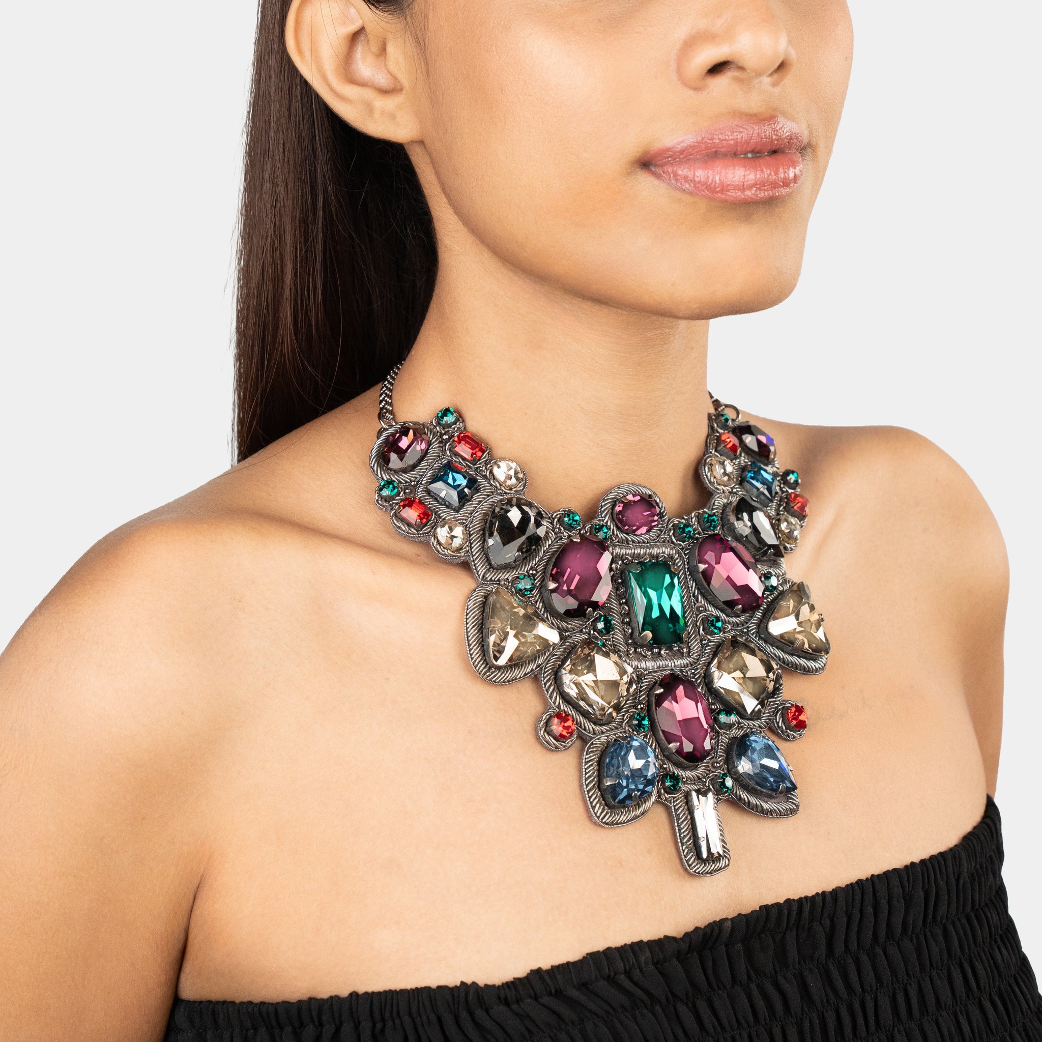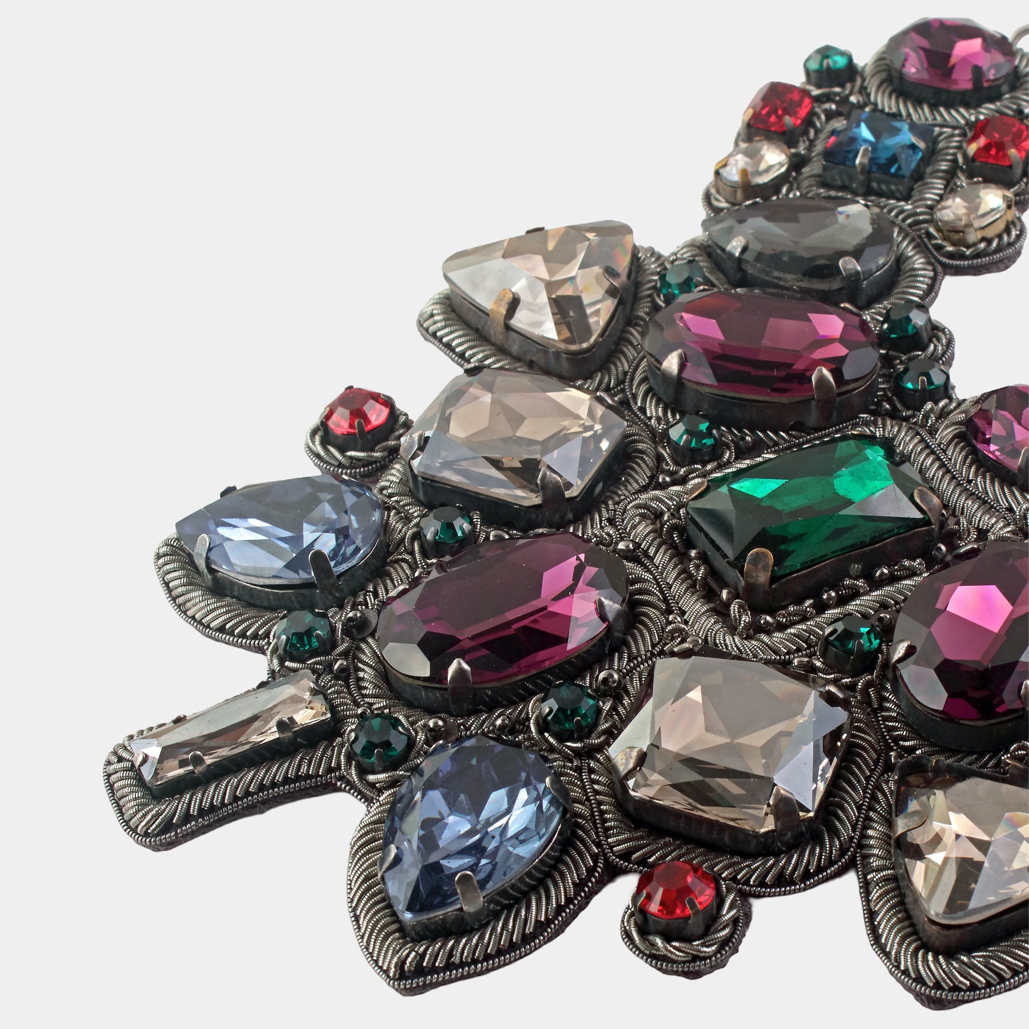 The Jodha Necklace in Gunmetal epitomizes grandeur with its rich tones and intricate hand embellishment on a sumptuous silk base. Adorned with crystals in jewel hues, emerald green, ruby red, sapphire blue, and amethyst, accented with golden metallic embroidery that creates captivating interplay with vibrant stones, delivering true statement sophistication for any collection with timeless opulent allure. The Necklace measures 38 cm by 19cm with an adjustable Toggle & T-bar closure.