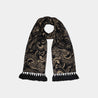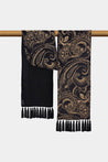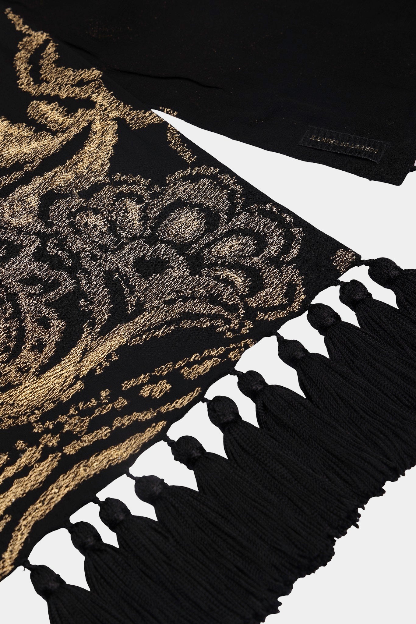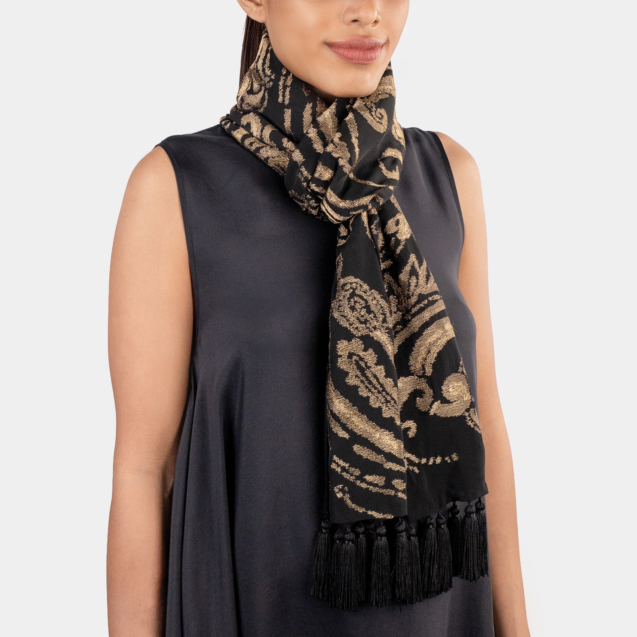 The Kota Wrap in Antique Golden epitomizes radiant charm with its rich paisley motif and sophisticated metallic allure. Meticulously crafted with golden metallic threads against luxurious black base, it creates a striking interplay of shimmer and captivating depth. This exquisite masterpiece features detailed tassels at the edges, adding refined elegance to every ensemble with timeless sophistication and versatile styling appeal.