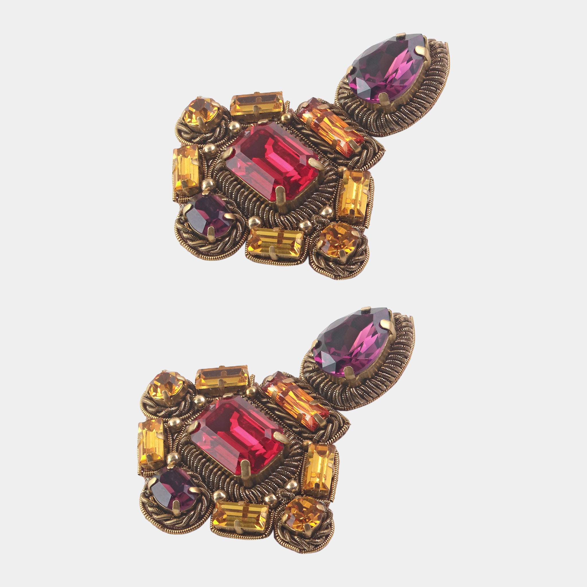 Intricately embroidered with layered golden metal elements, they feature radiant red, amber, and citrine-toned crystals, accented with purple teardrop stones that exude sophistication. Each gemstone is meticulously set to create a striking composition of color and brilliance.