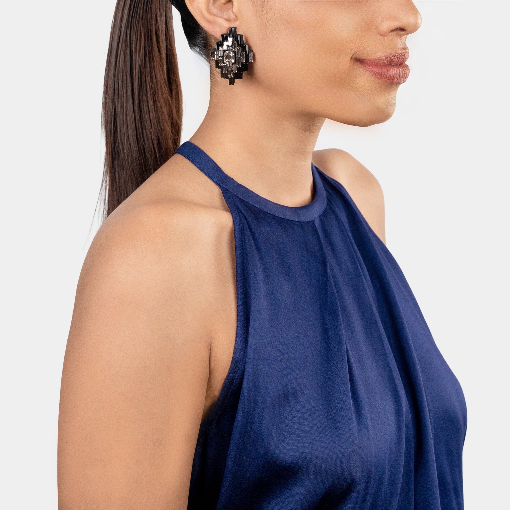 The Nargis Ear Studs in Black are the epitome of classic elegance with a contemporary twist. Crafted with jet-black bugle beads, clear crystals, and a faceted black gemstone at the center, these studs exude understated sophistication. Designed to complement both monochrome and colorful outfits, they serve as the perfect, versatile luxury accessory for any occasion.