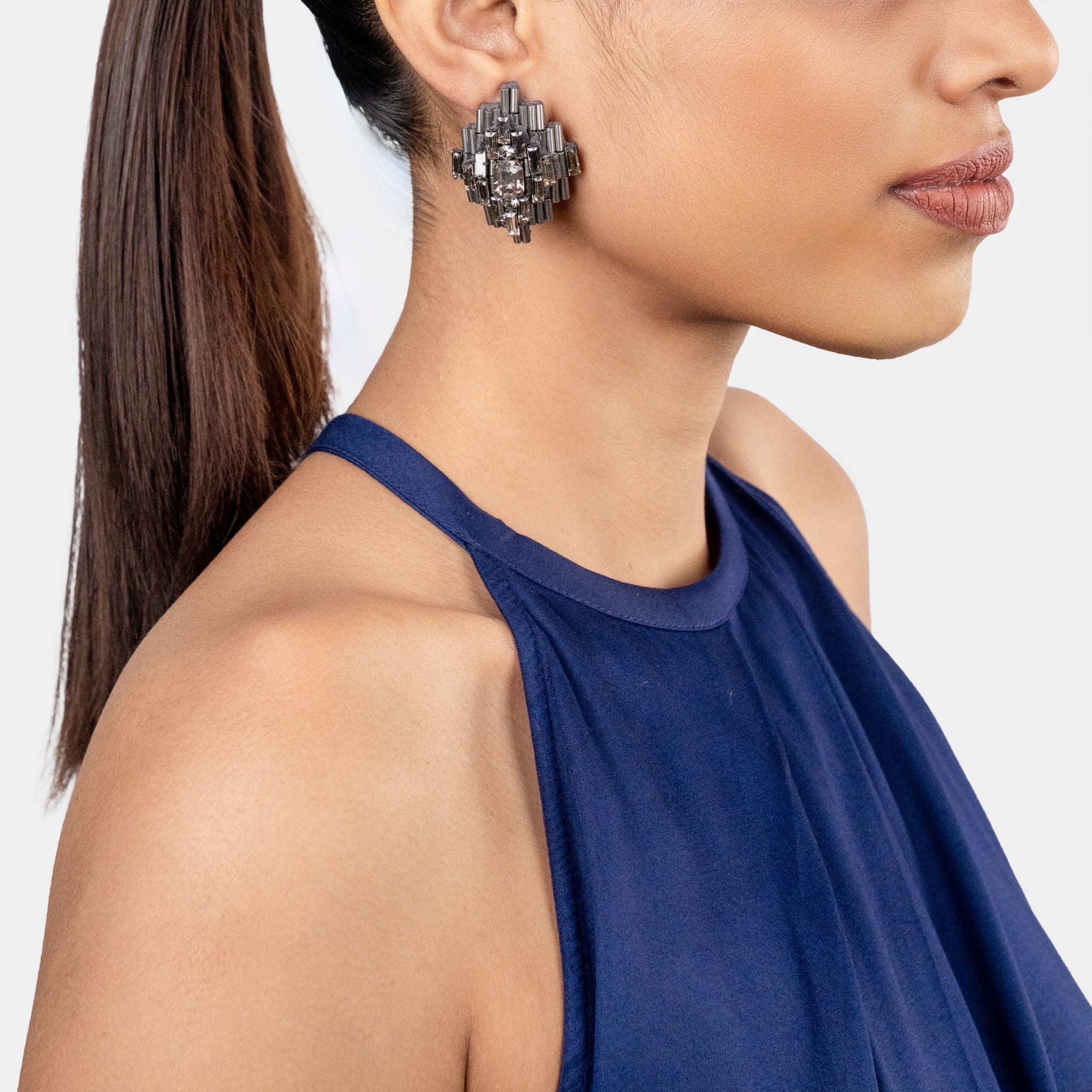 Bold and striking, The Nargis Ear Studs in Gunmetal are perfect for those who embrace modern glamour with a hint of edge. Embroidered with glimmering silver baguette beads, black crystals, and a deep gunmetal-toned centerpiece, these studs create a captivating contrast that adds drama to any look. Whether styled with an evening gown or tailored attire, they make for the ultimate statement piece.