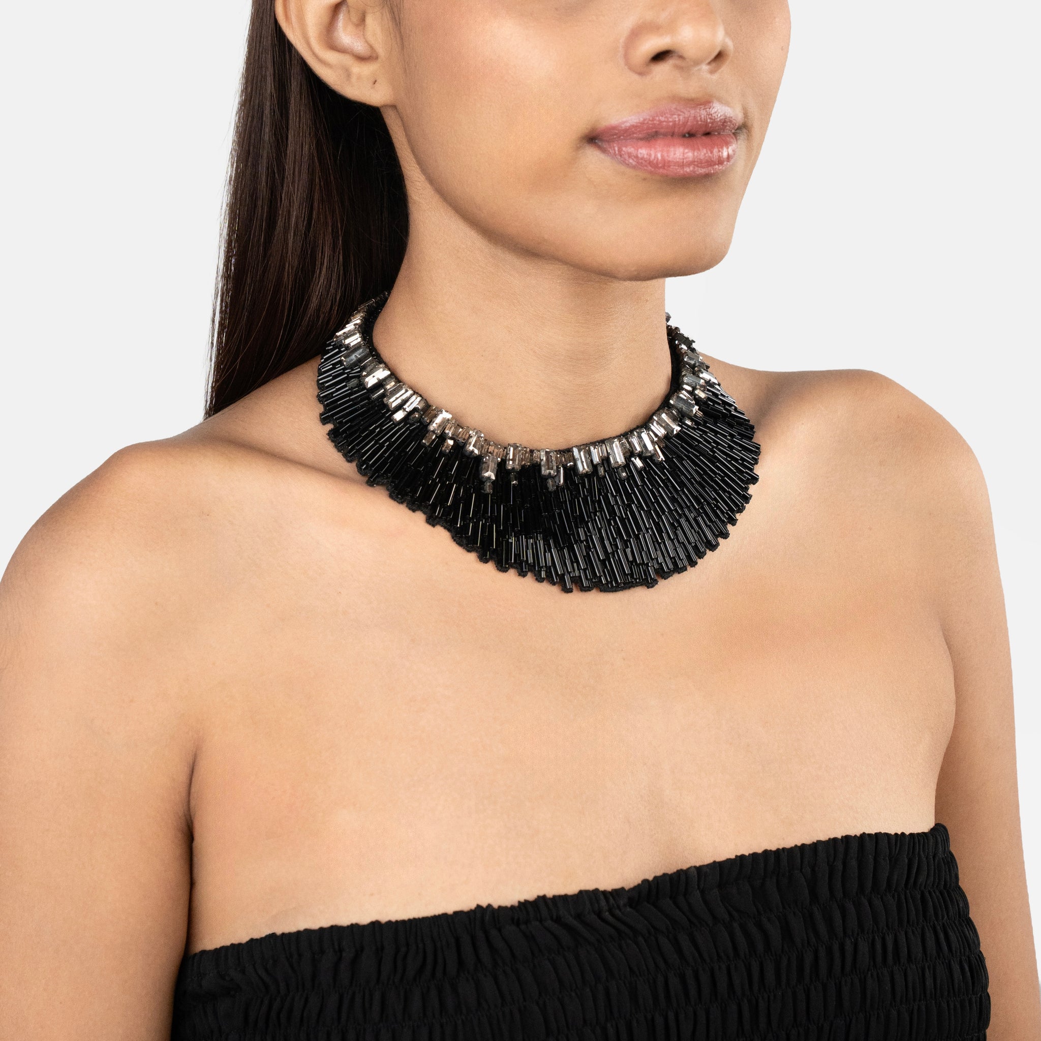 The Nargis Necklace in Black epitomizes powerful sculptural elegance with its commanding presence and sophisticated monochrome appeal. Meticulously hand-embroidered on sumptuous silk base, it showcases layers of jet-black bugle beads accented with shimmering crystals that create captivating depth and contrast. This striking masterpiece delivers refined luxury that enhances both structured tailoring and fluid evening ensembles with timeless sophistication.