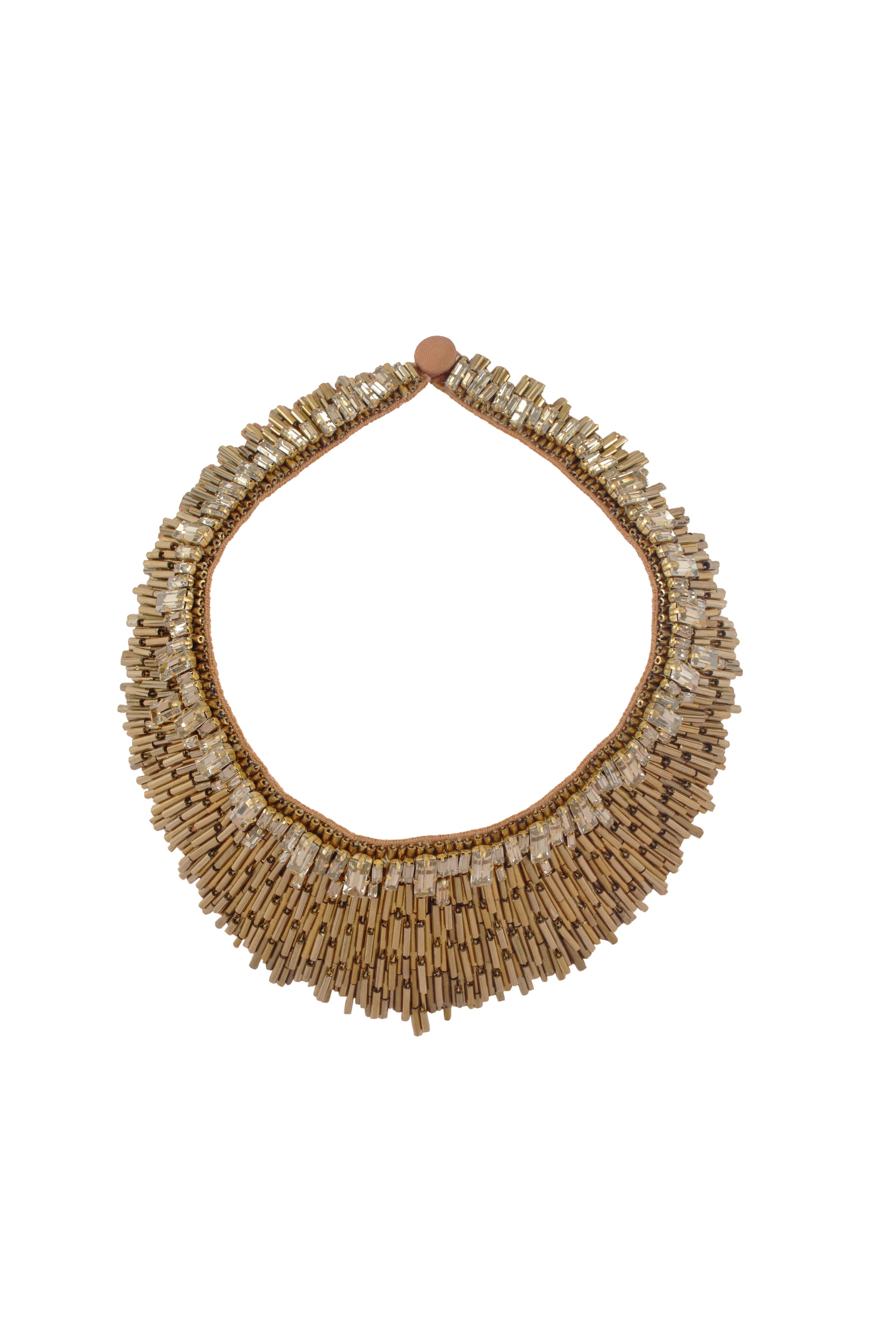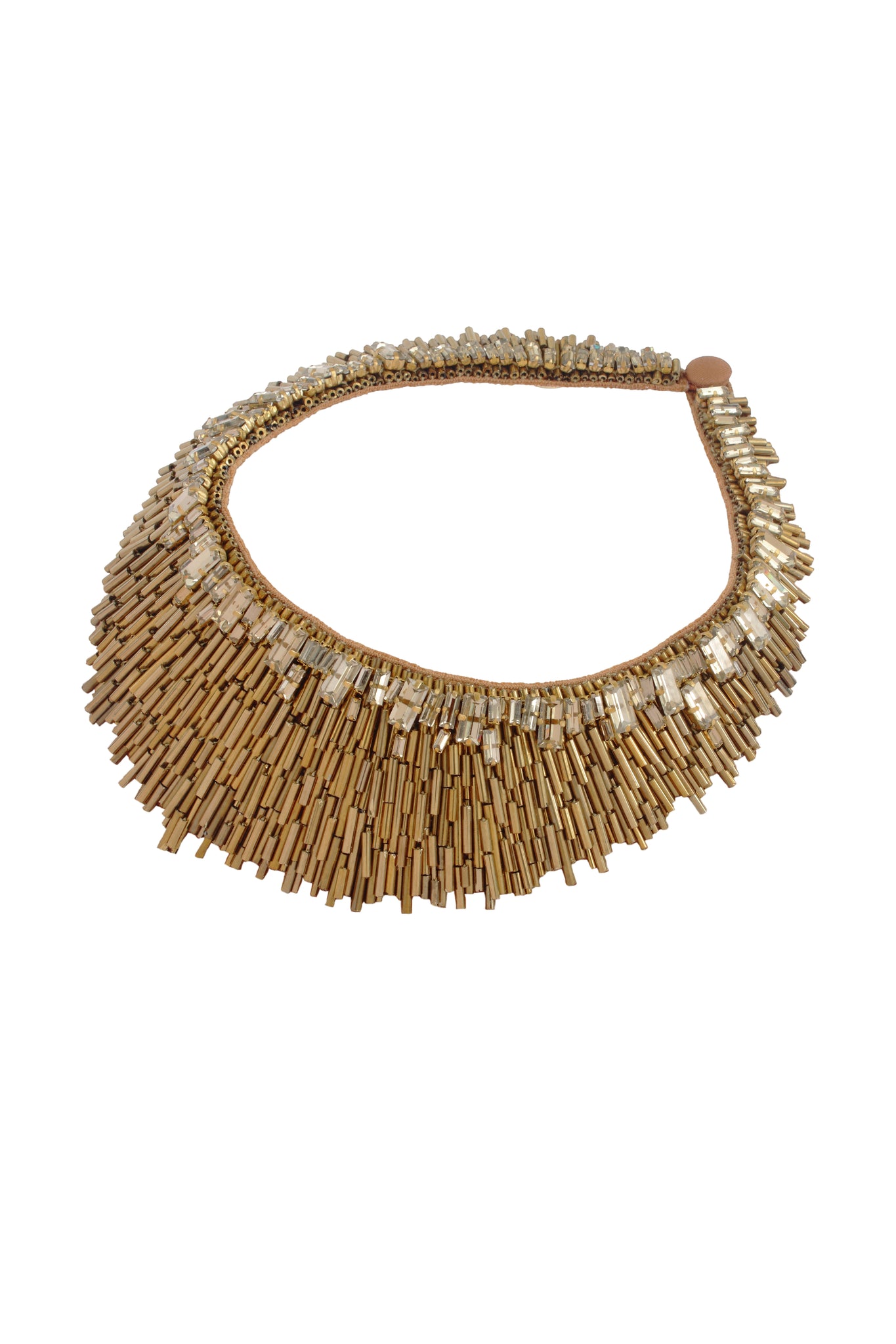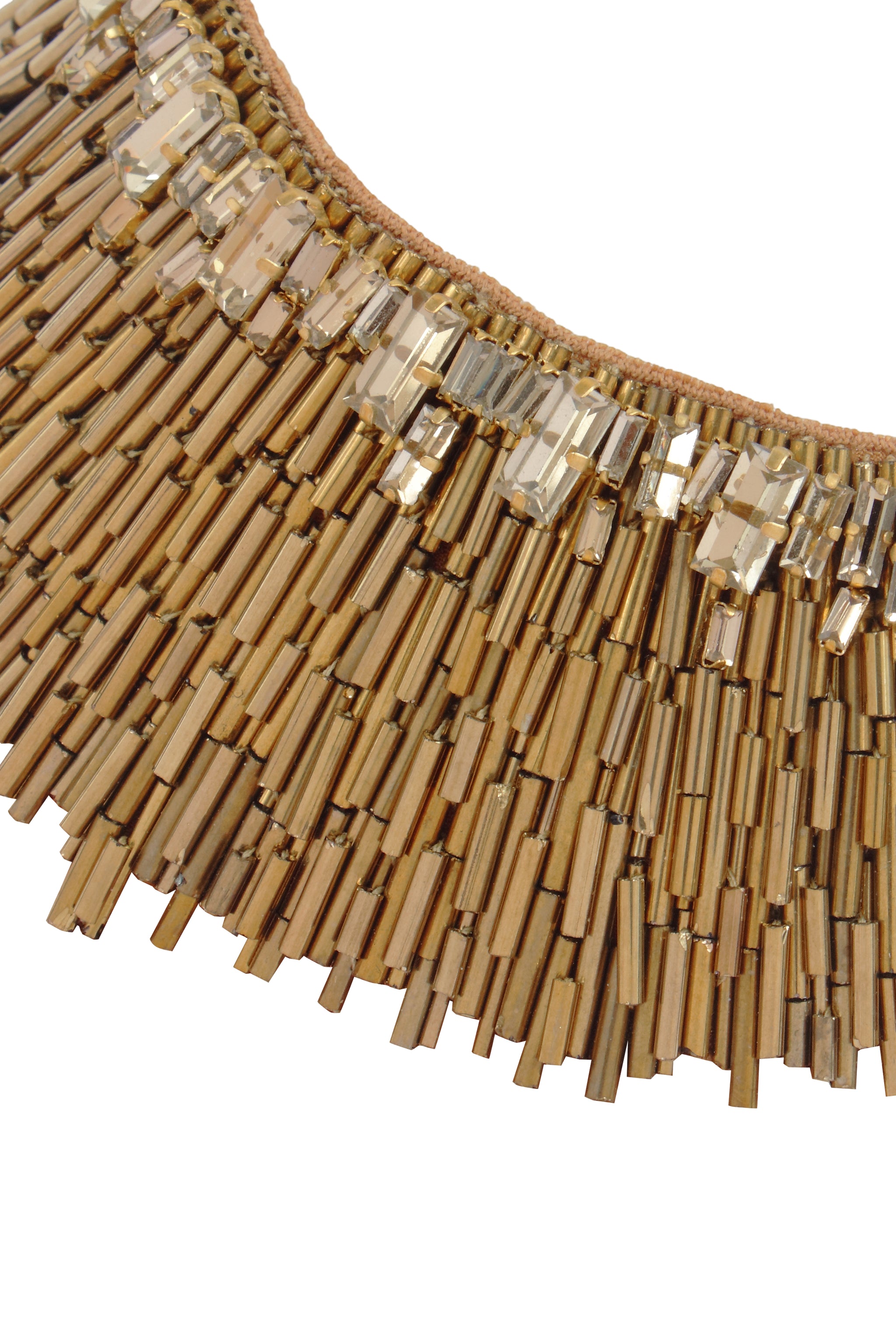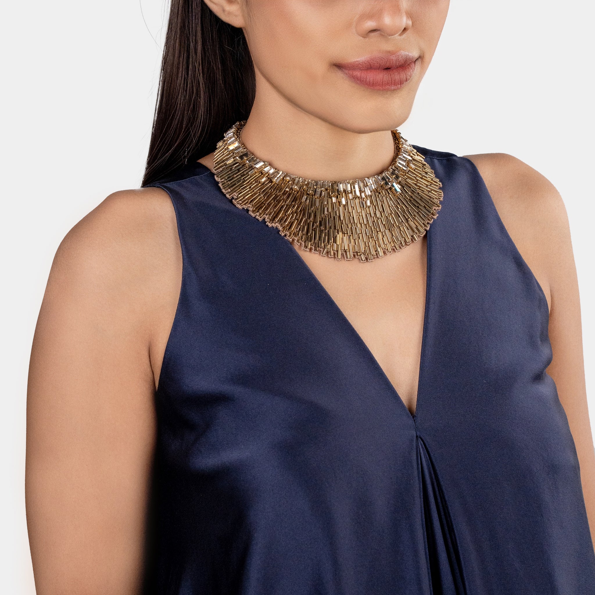The Nargis Necklace in Gold epitomizes luminous sophistication with its radiant metallic allure and exquisite craftsmanship. Meticulously hand-embroidered with golden bugle beads and faceted crystals, it captures light beautifully, creating a brilliant interplay of texture and shine. This stunning masterpiece brings warmth and refinement that seamlessly elevate both contemporary silhouettes and timeless ensembles.