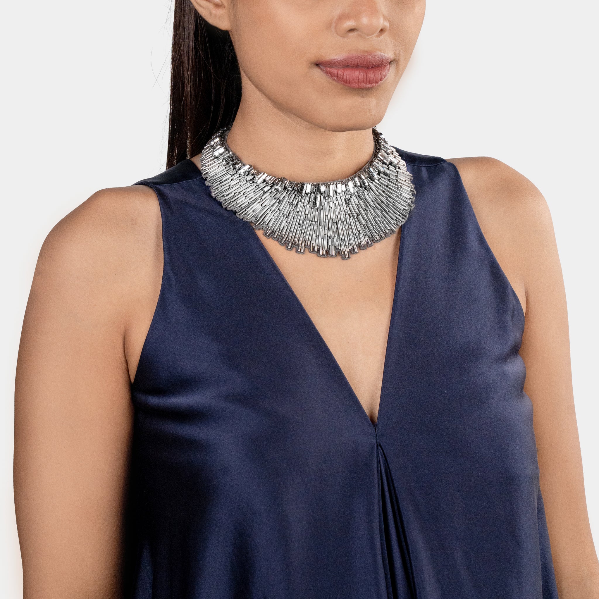 The Nargis Necklace in Gunmetal epitomizes contemporary strength and elegance with its bold architectural presence and sophisticated metallic appeal. Meticulously handcrafted with layers of gunmetal bugle beads and sparkling crystal accents, it creates a striking rhythm that reflects light with a subtle metallic sheen. This commanding masterpiece delivers modern edge and versatile luxury that enhances both minimalist sophistication and elevated evening ensembles.