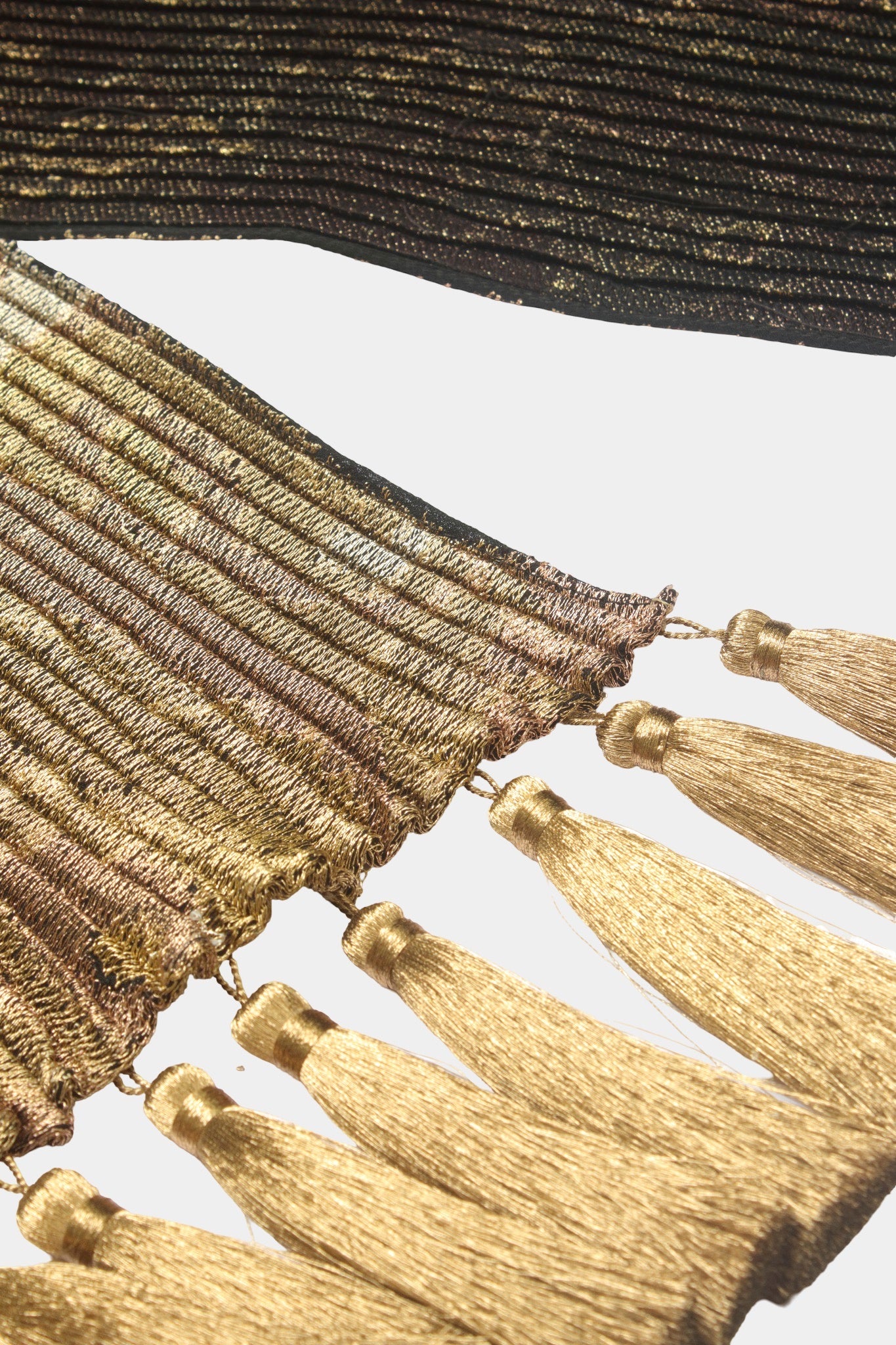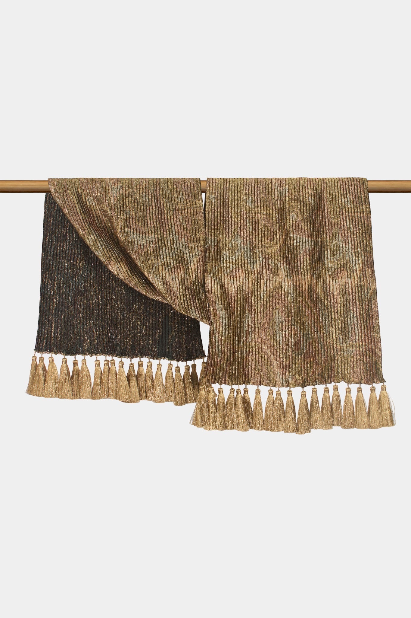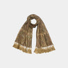 The Pleated Paisley Wrap in Antique Gold embodies timeless artistry with its rich interplay of deep black tones and shimmering golden threads. The intricate paisley motif, accentuated by delicate pleating, creates refined depth and texture, while hand-finished tassel edges add graceful movement. This wrap is a versatile statement accessory that captures elegance and warmth with every drape.