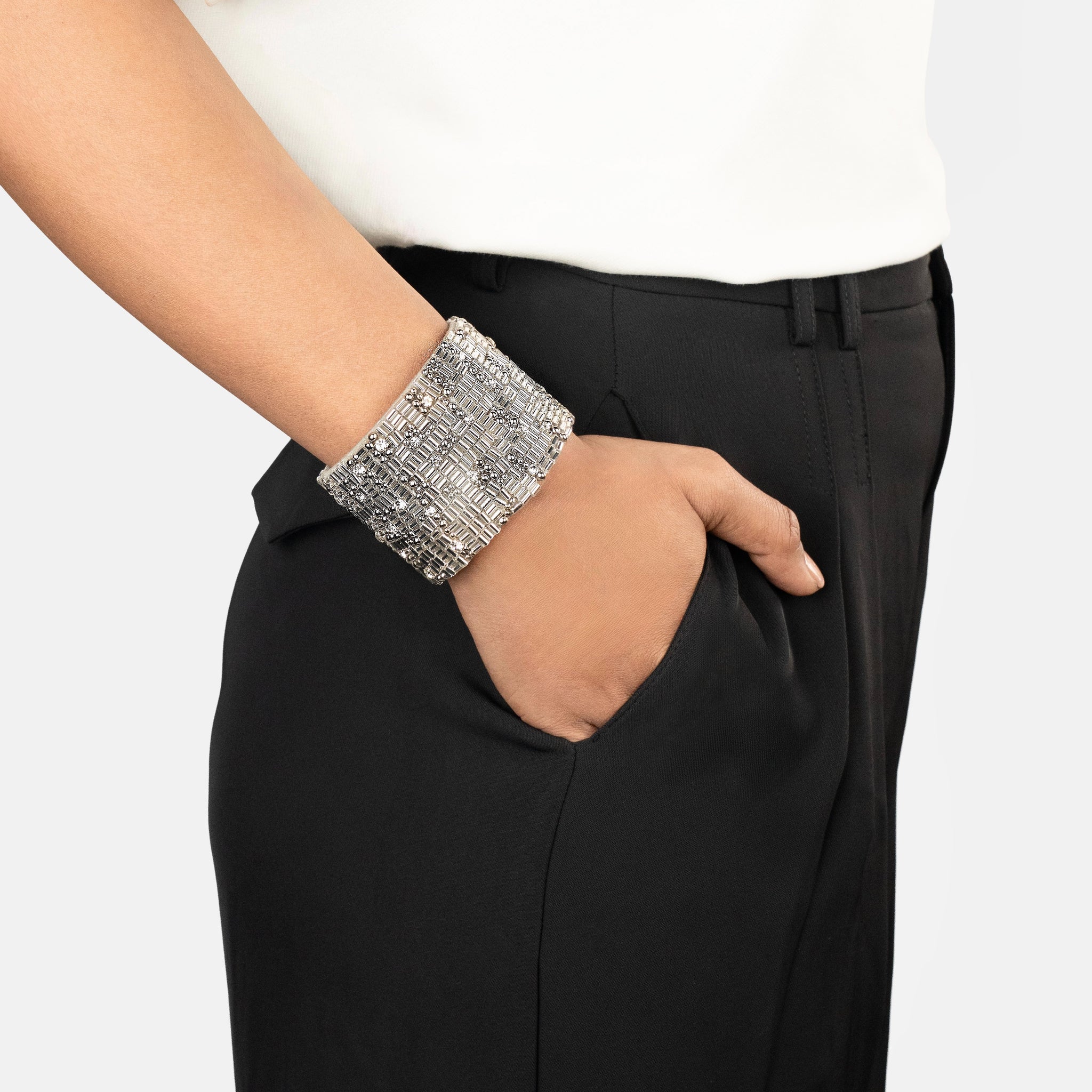Embroidered on a silk base using metallic silver bugle beads and radiant crystals, it creates a refined, luminous effect. The cool-toned palette makes it a versatile accessory for both minimalist and bold ensembles.