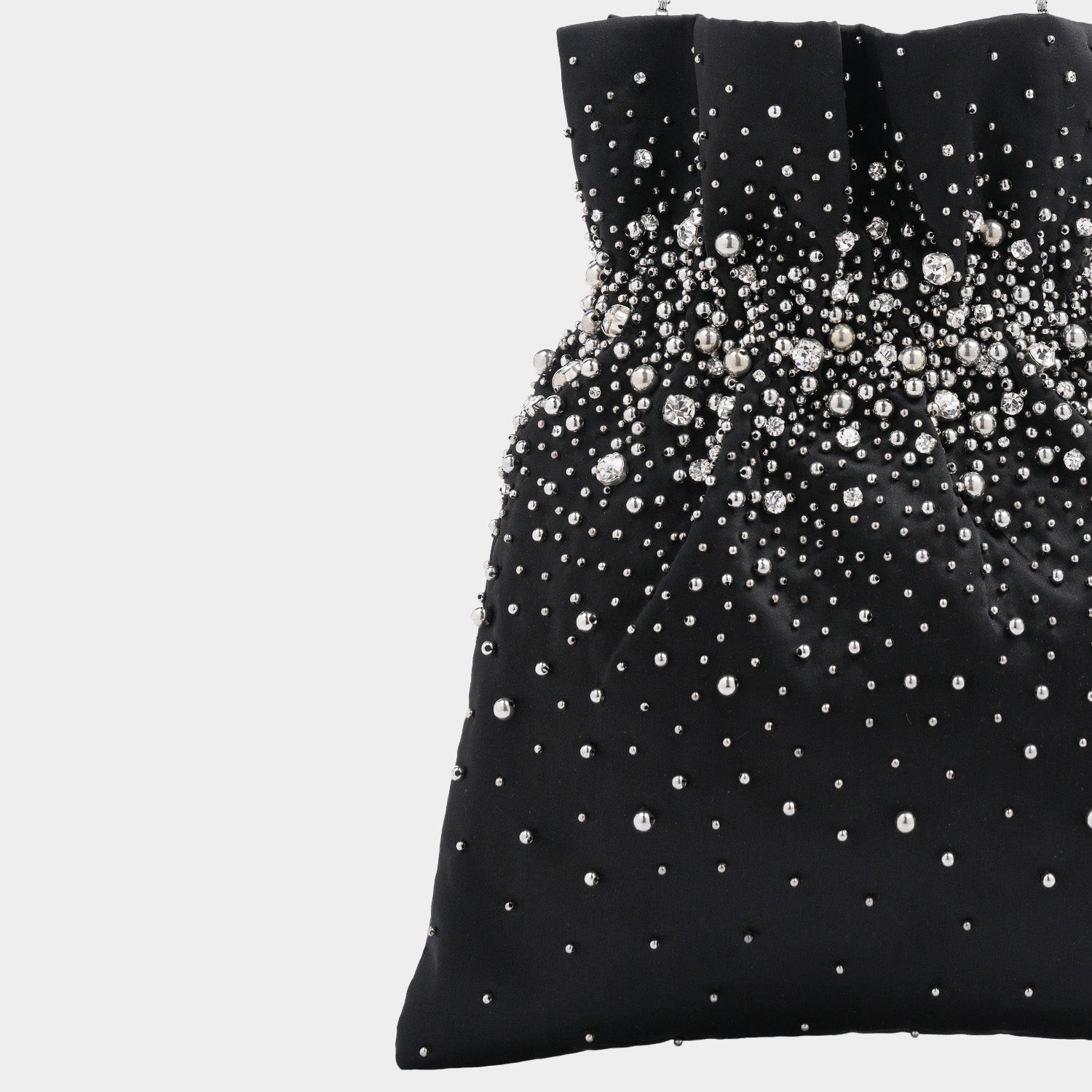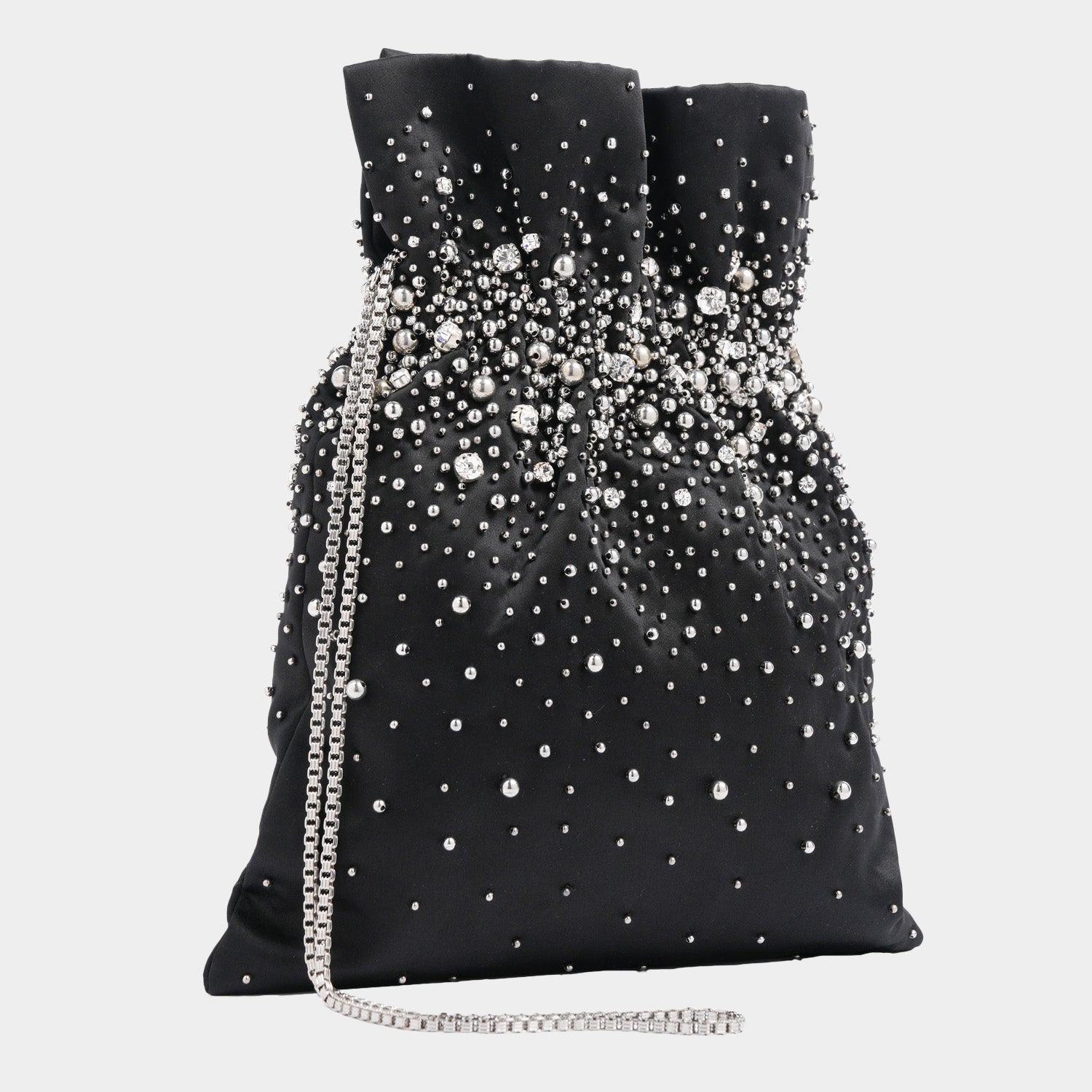 Is It a Butwa? Is it a Potli bag? No, It is a Cabochon Pochon Bag! This Pleated Bag reminds one of the famous drawstring bag but with a twist. This bag with scattered Crystal and Cabochon bag in black is a must have.