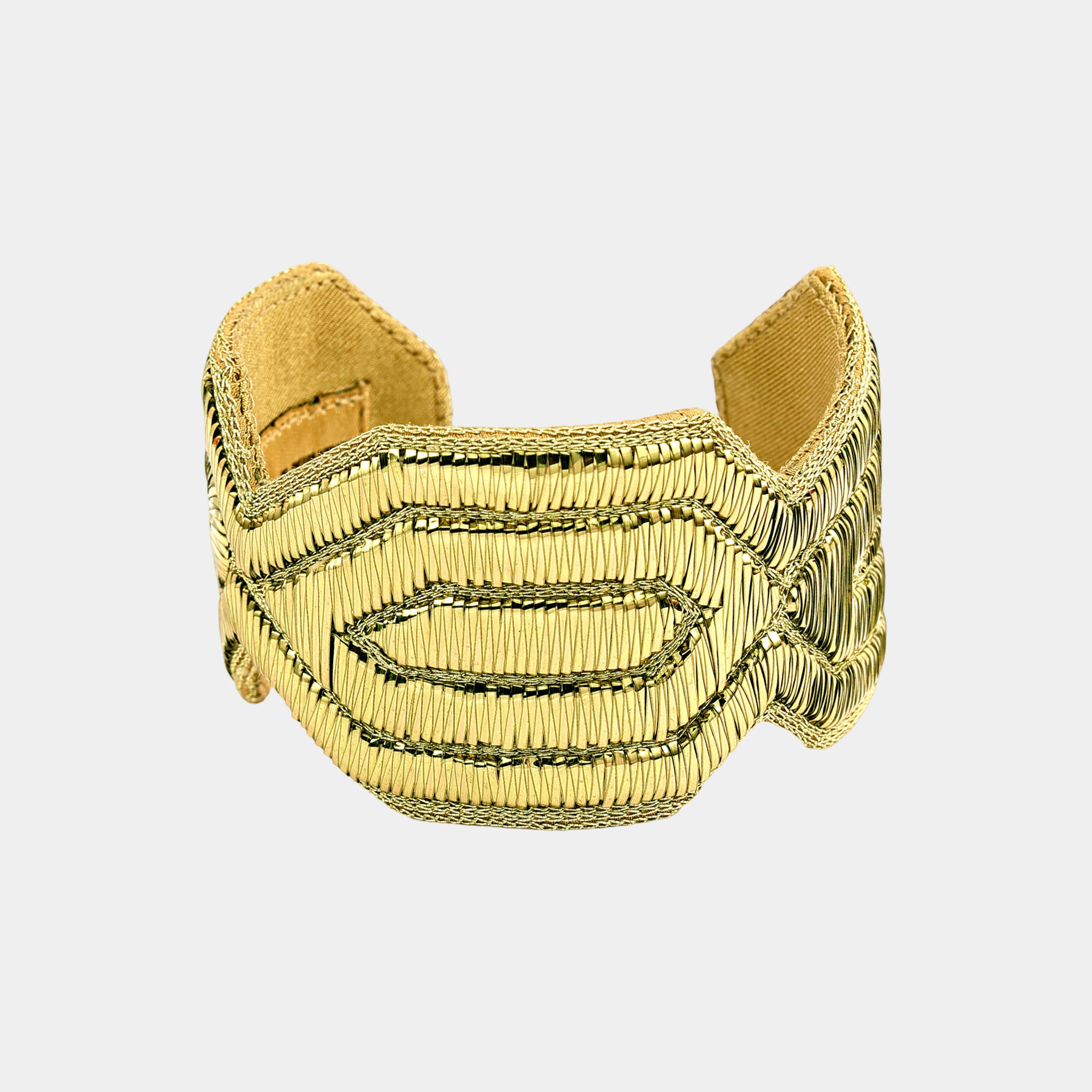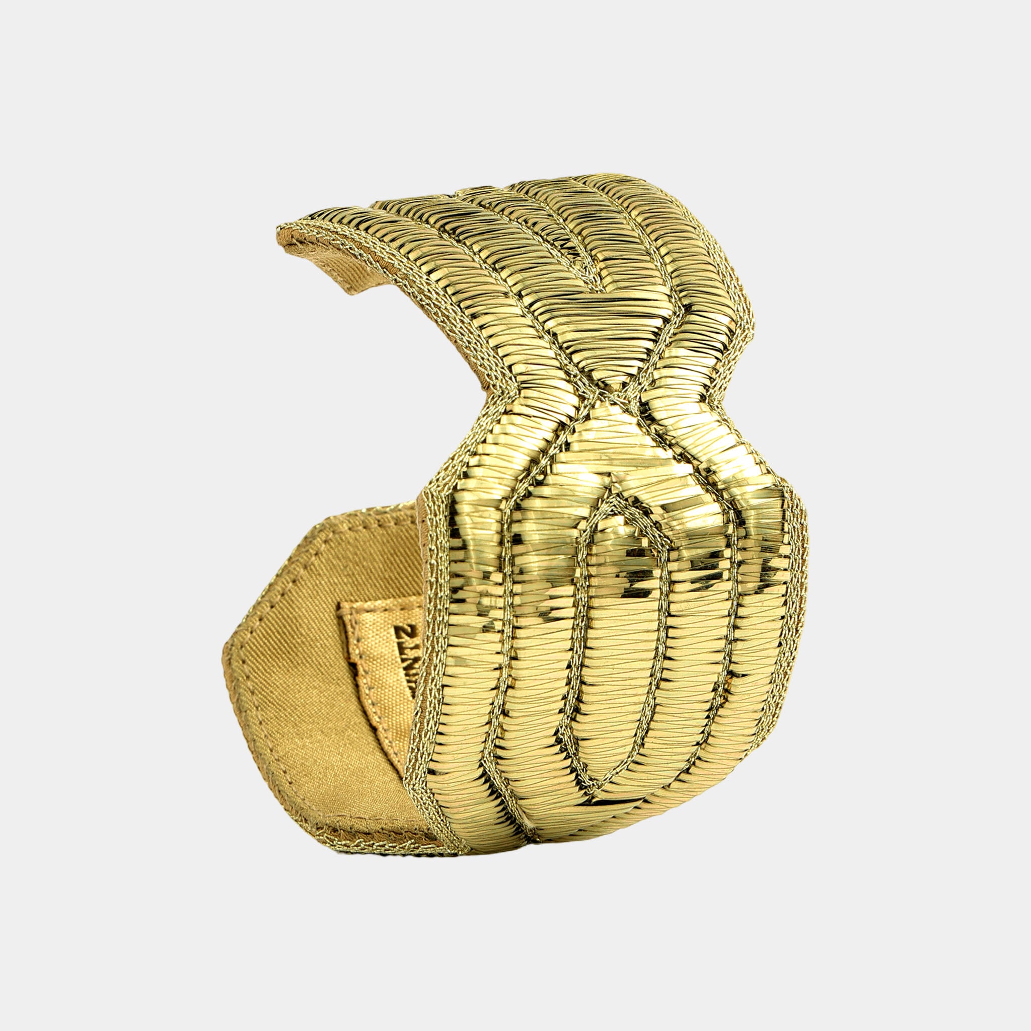 The Nilofer Cuff in Gold is a celebration of modern opulence with a nod to artisanal heritage. Hand-embroidered with metallic thread in sculptural wave patterns, this bold statement cuff is designed on a neutral-toned base for maximum versatility. Its structured form and intricate detailing make it a refined yet striking accessory to elevate any ensemble.